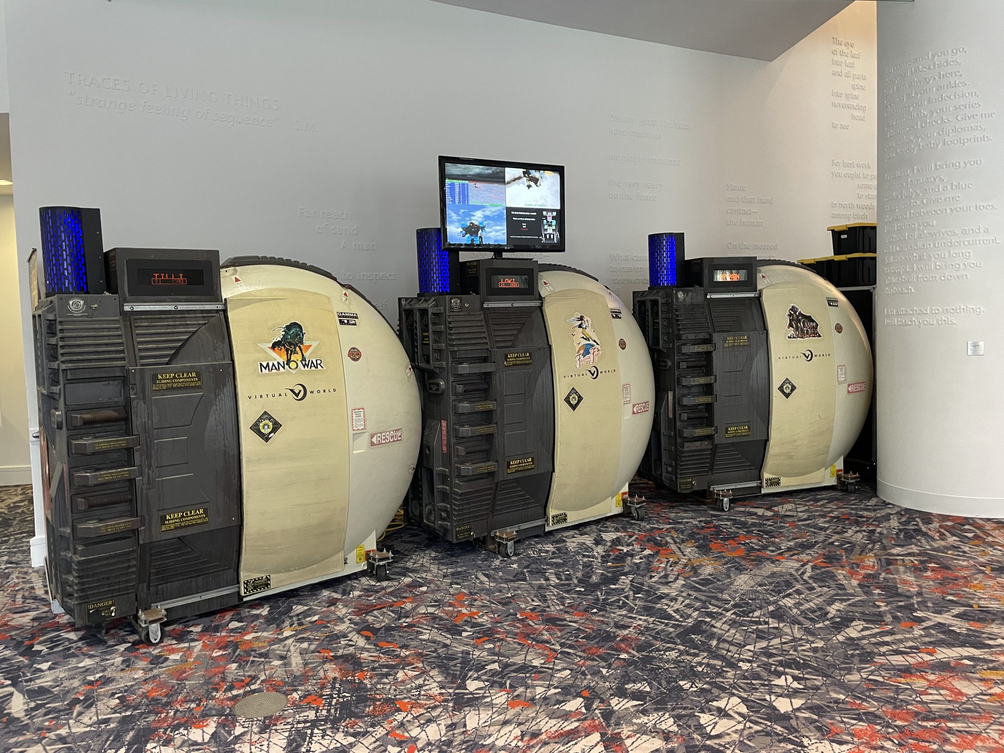 We headed back to the convention center, where Matt and I got to play the Mechwarrior pods. These enclosed arcade cabinets ran a version of