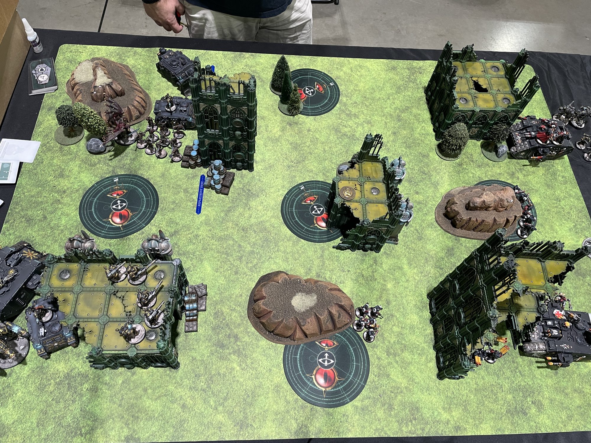 Pat is an extremely talented painter and a great player to boot, part of the secret brain trust of Space Marine players I regularly talk strategy with. We've played a few times over the years, and every time I manage to himbo my way to victory, either through making some mistake that accidentally goes my way, thinking a rule works one way only to find it works in another, more advantageous way that saves my bacon, or otherwise slamming my idiots head first into his idiots and coming out on top. What follows is an absolute brain puzzle where each turn, one or both of us has the thought of "I'm so fucked" before handing that radioactive thought to the other player. I expose my Godhammer Land Raider in an attempt to hit his Repulsor Executioner, only to bounce off and lose my tank turn 1, stranding Helbrecht in my backfield. I'm fucked. He overextends with his Dreadnought into the center of the board, giving the Helbrick a slingshot it can use to get back into the game. He's fucked. Now I'm in his side of the board, trying to work around his own reactive moves and counter charges, cutting down his tanks in melee and getting shot to pieces in return. We're both fucked. At the bottom of turn 4, we've got a paltry handful of assets between us, separated by an empty no man's land that would make Trench Crusade players itch. He works the angles and there's no way to get around to my stuff and do anything, and we total up the score. It's a 78-48 win for my Templars, but it felt like it was on a knife edge for the entire battle. As always, it's a pleasure playing Pat, and the kind of high level play that makes both of us better players in the end. It was a great note to go out on, as this was my final game of the event.