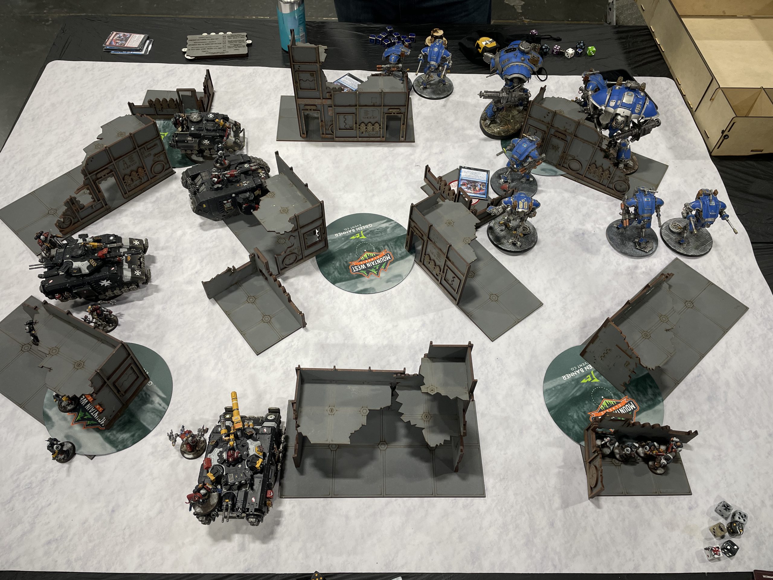 Charlie was defending, and as such had chosen a WTC layout for our game. I had never played on one of these before, would play on several more this event, and dearly hope I never play on them again. Setting up the board felt like taking a trigonometry test I'd never studied for, and took us maybe fifteen minutes. Once we were set up, I wondered why he'd taken this table, as while it would provide some protection from my shooting, it would make it exceedingly hard for his Knights to move around. Each of his thirteen War Dogs were named after a different pop culture dog, and while this detachment made it hard to track characters for my purposes, it was a very good matchup for me.
