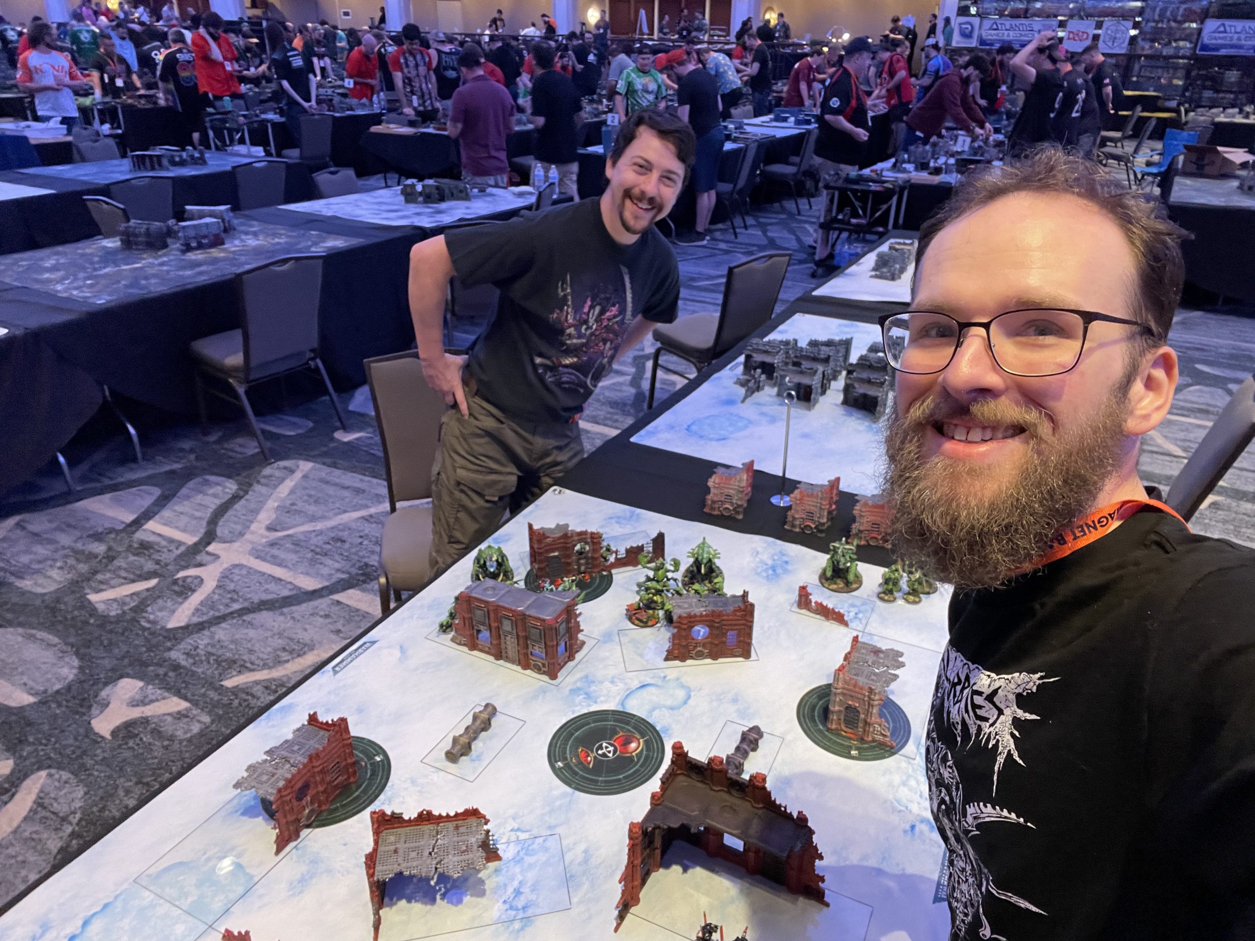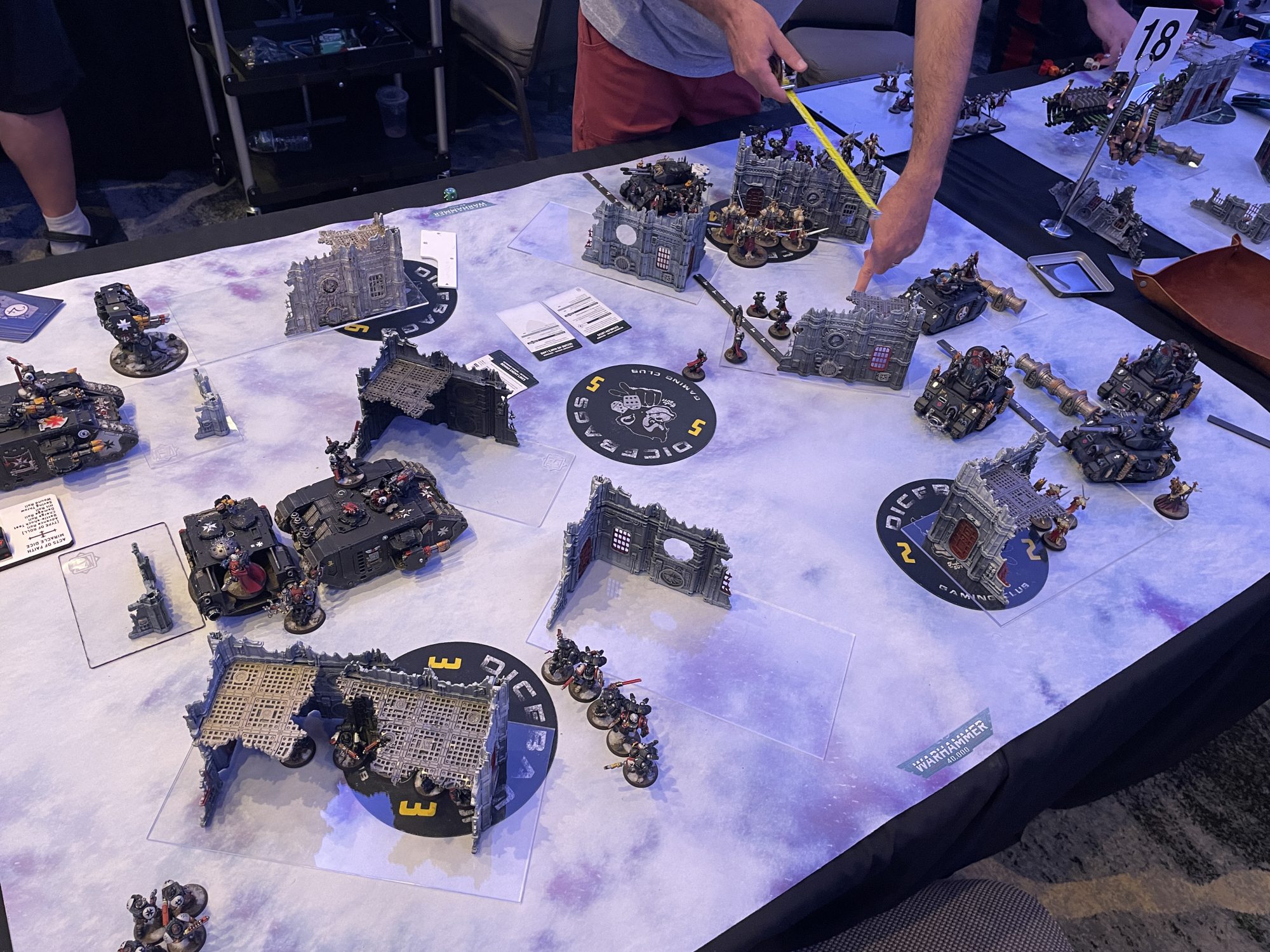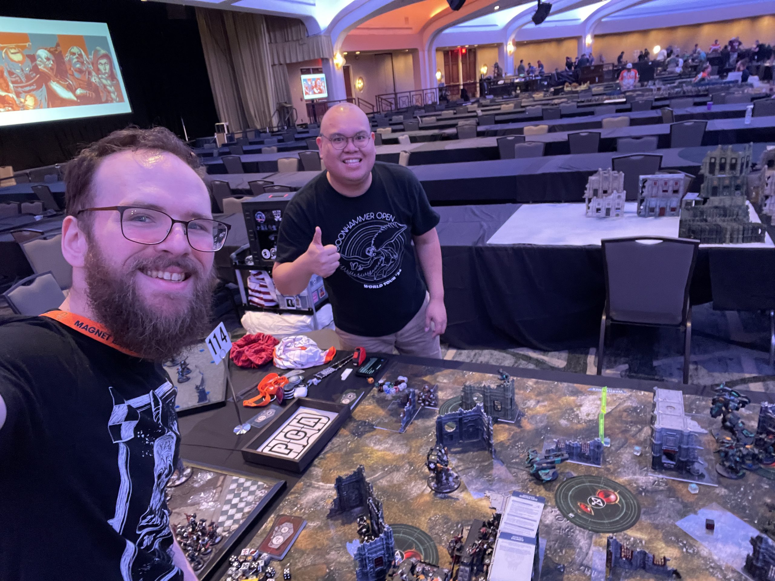 Goonhammer writer had been wanting a game with me, and I was more than happy to deliver. This game was regrettably a bit one sided, as he was still actively judging at the time. While he only got pulled away to make a call or two, every time someone yelled "JUDGE!" he'd spin on the spot to make sure someone was taking care of it. As a result he missed a few of his big plays, getting interrupted by a player in need when he was trying to pull off his "go" turn. His dice also did not help, with failed Battleshock tests, an alarming number of failed Hazardous tests, and some above average saves on my part definitely snubbing his T'au strategy.