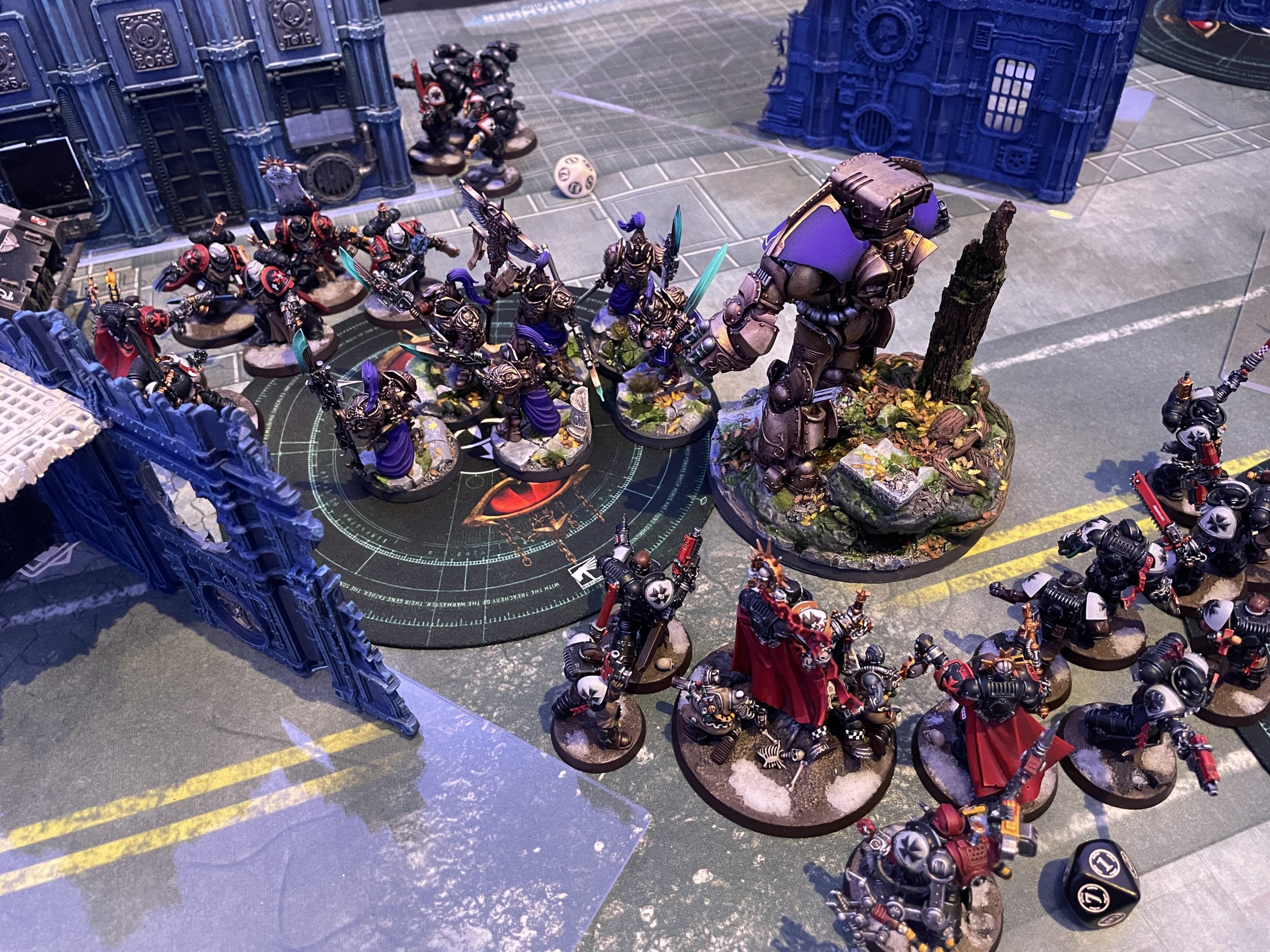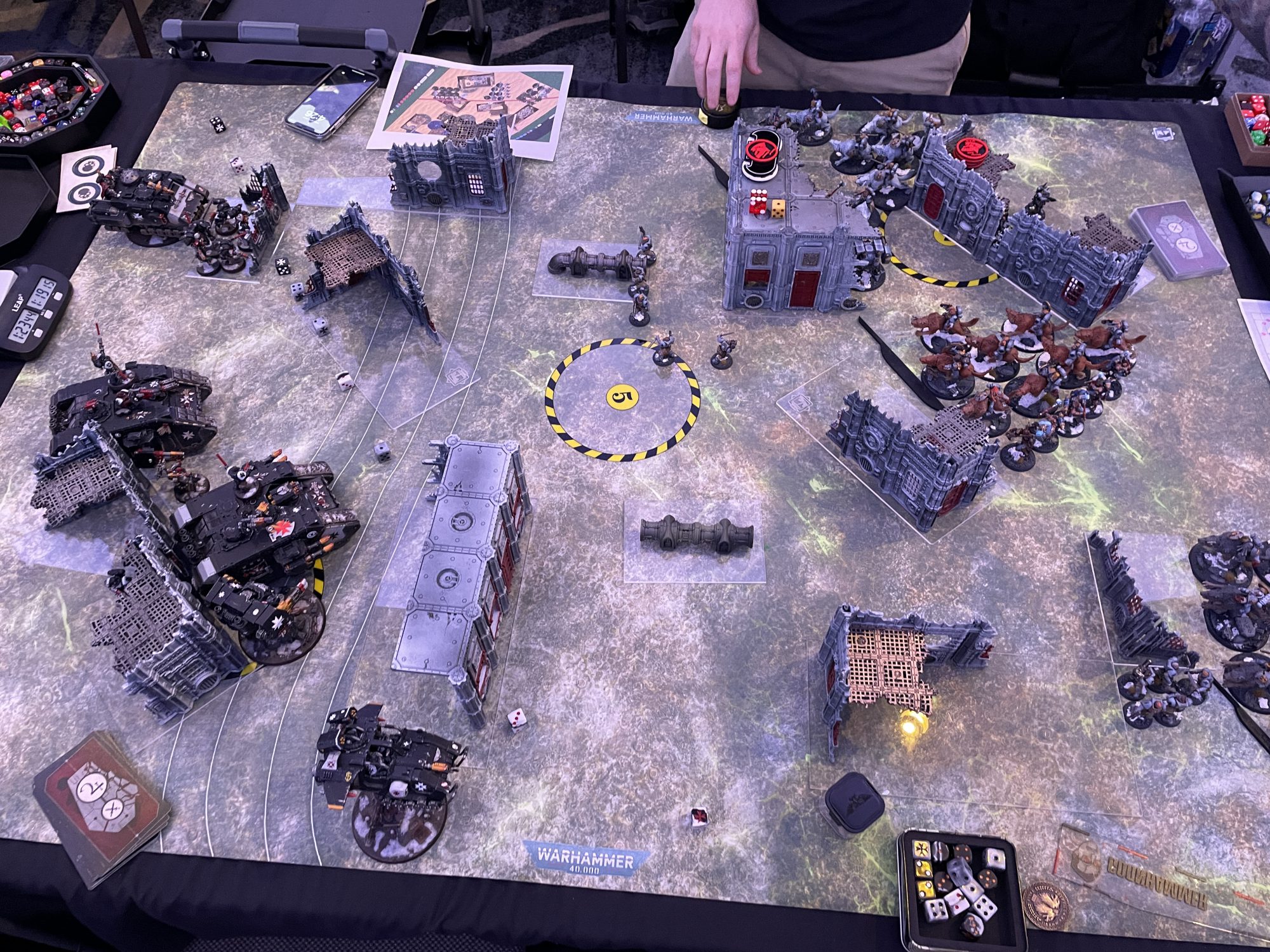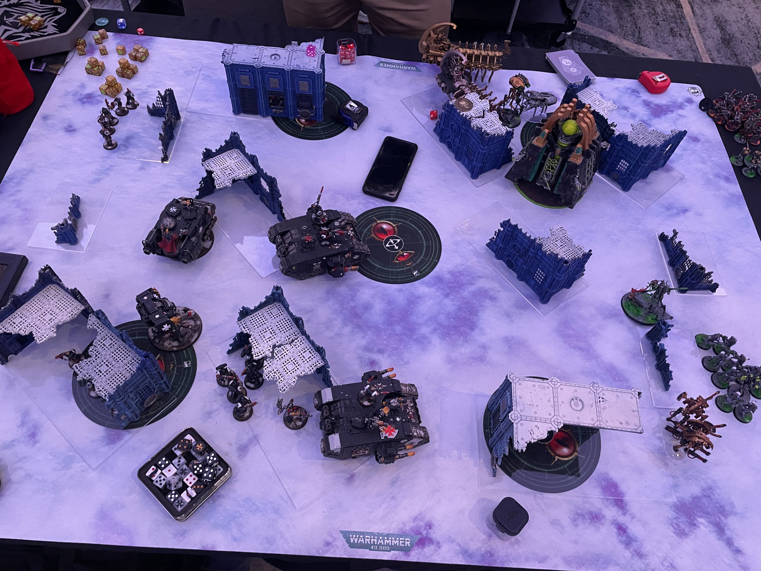 Goonhammer writer had been wanting a game with me, and I was more than happy to deliver. This game was regrettably a bit one sided, as he was still actively judging at the time. While he only got pulled away to make a call or two, every time someone yelled "JUDGE!" he'd spin on the spot to make sure someone was taking care of it. As a result he missed a few of his big plays, getting interrupted by a player in need when he was trying to pull off his "go" turn. His dice also did not help, with failed Battleshock tests, an alarming number of failed Hazardous tests, and some above average saves on my part definitely snubbing his T'au strategy.