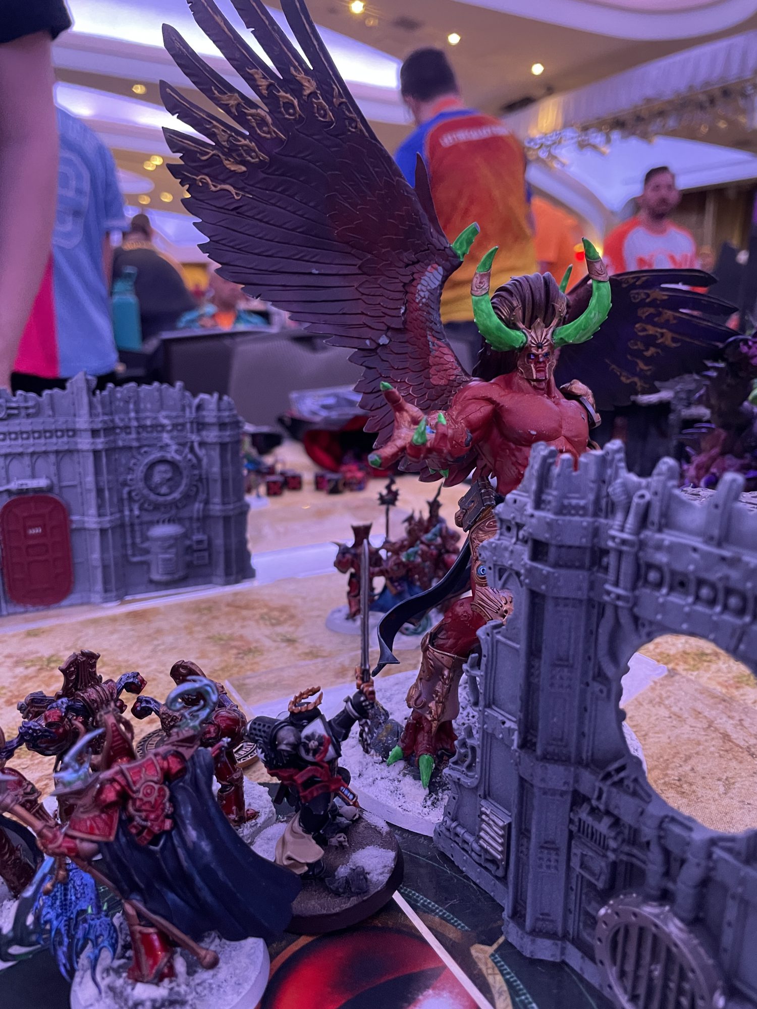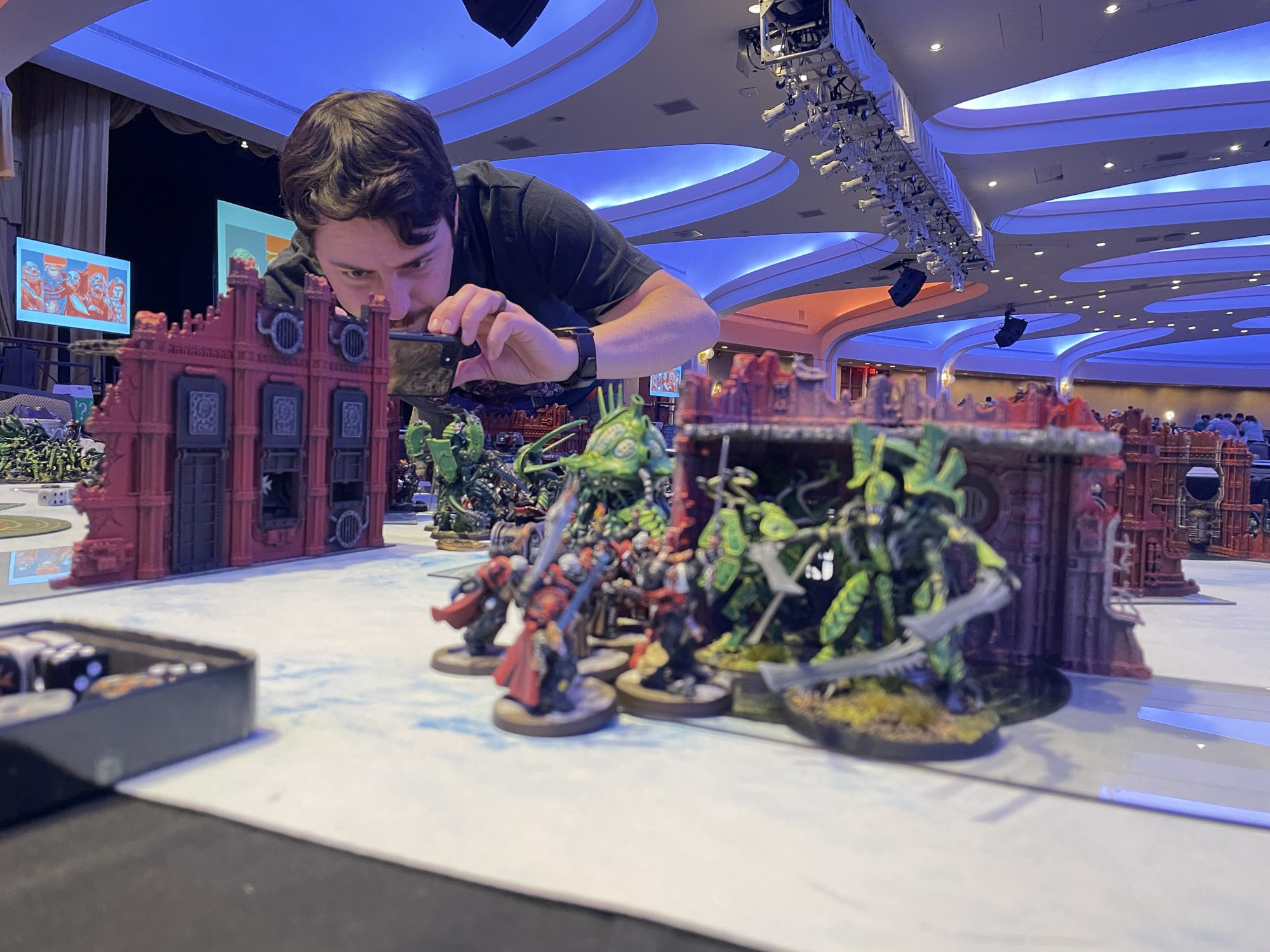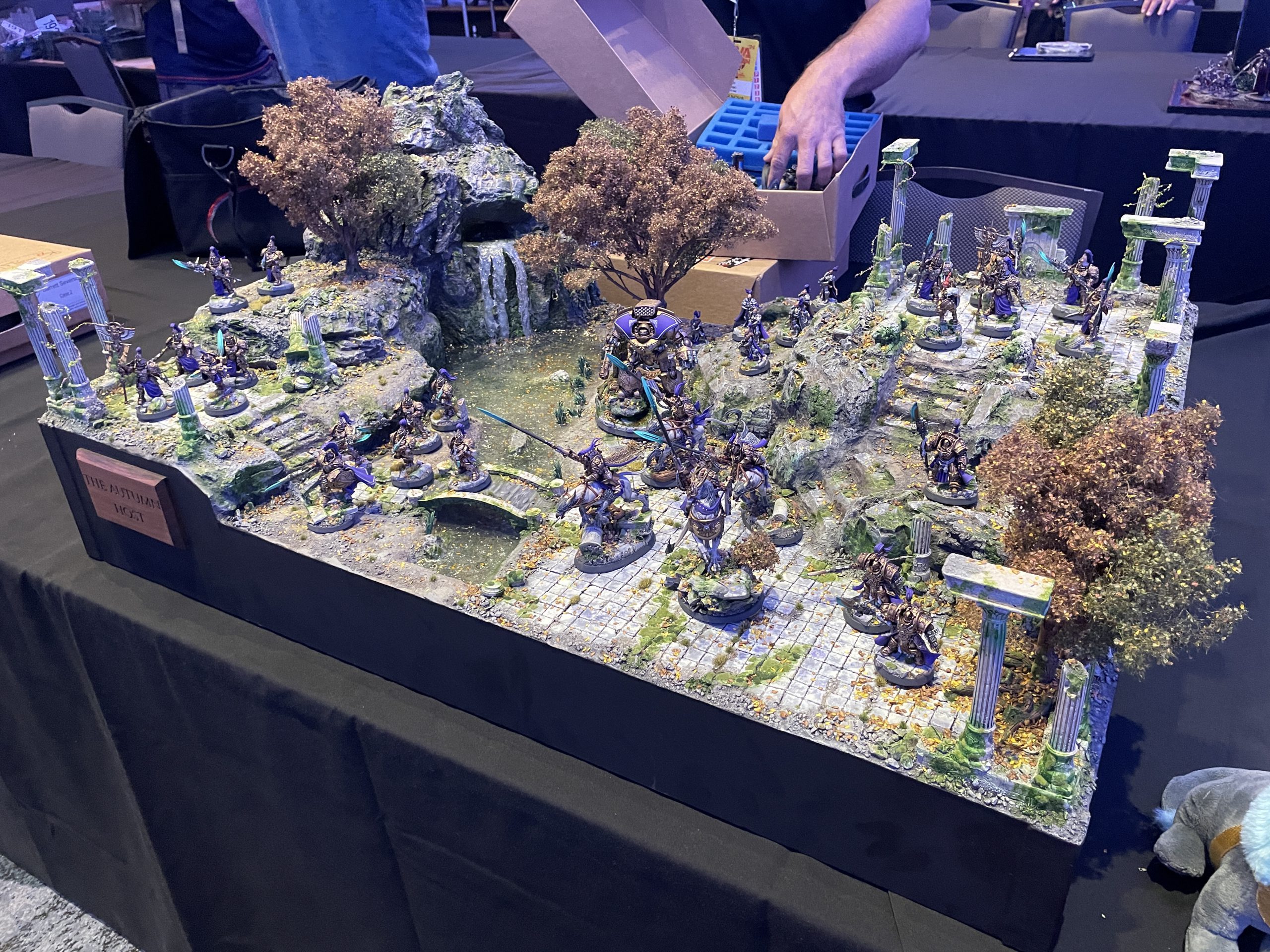 I had been invited to the 40k GT showcase earlier that day, and I went down to the judging area to collect my army, check out the rest, and see who was down there. I found my crew and looked over all the boards and armies. Critiquing models with other painters is always illuminating, and can give you a peek into their preferences and own painting style. Doing that with the Goonhammer team is still one of my favorite parts of the deeply cursed trip to the
