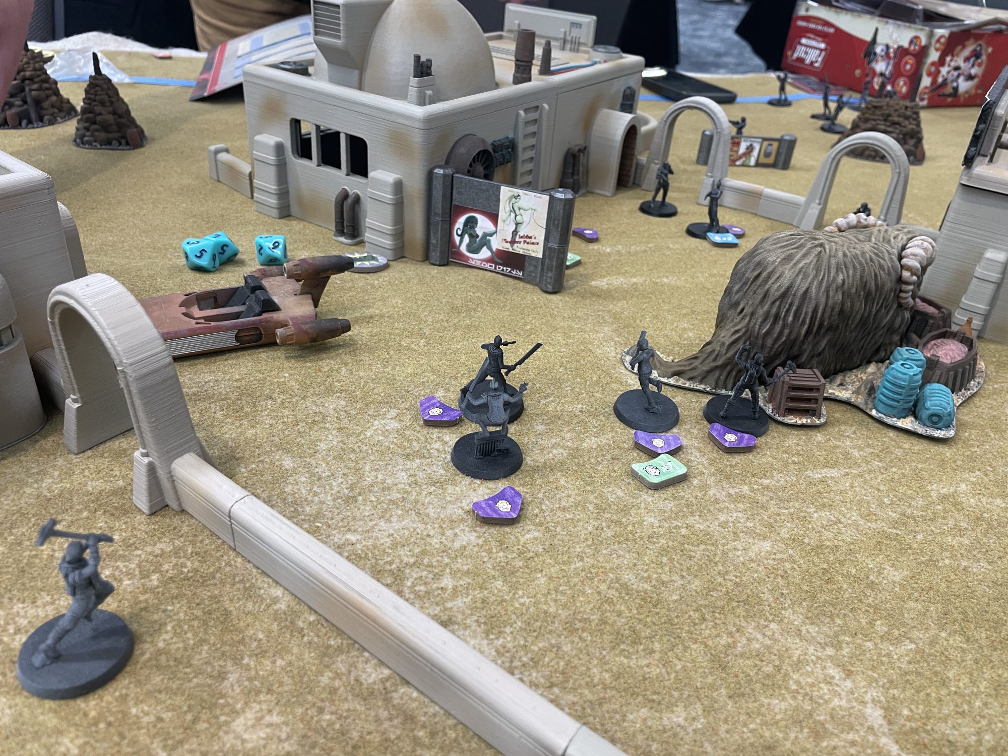 Badcast Discord were hanging out and slamming their knights together in joust after joust. Each round was announced by the collective cheer of "Let's! Get! Tilted!" before players revealed their maneuvers and rolled their dice. I jumped in for one round and took someone's Goblin knight for a spin. I aimed for the head every time and didn't dismount my opponent, but still got more points than they did and helped my team towards victory. The highlight was when Will (Texas) and Will (Maine) faced off, and the opening shout was revised to "Let's Get Wilted!" for this literal battle of wills. It's a beer and pretzels game that is more firmly devoted to the pairing of beverage and snack than it is to being particularly deep or nuanced (same, tbh), and one could honestly play it without miniatures at all. That said, it's exactly the kind of simple party game you want to see at this hour during a con, and makes for an easy game to drop in and out of.