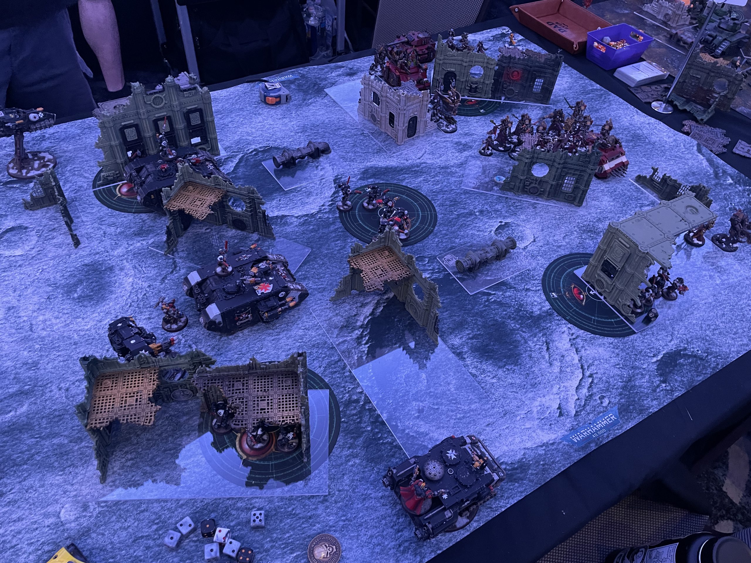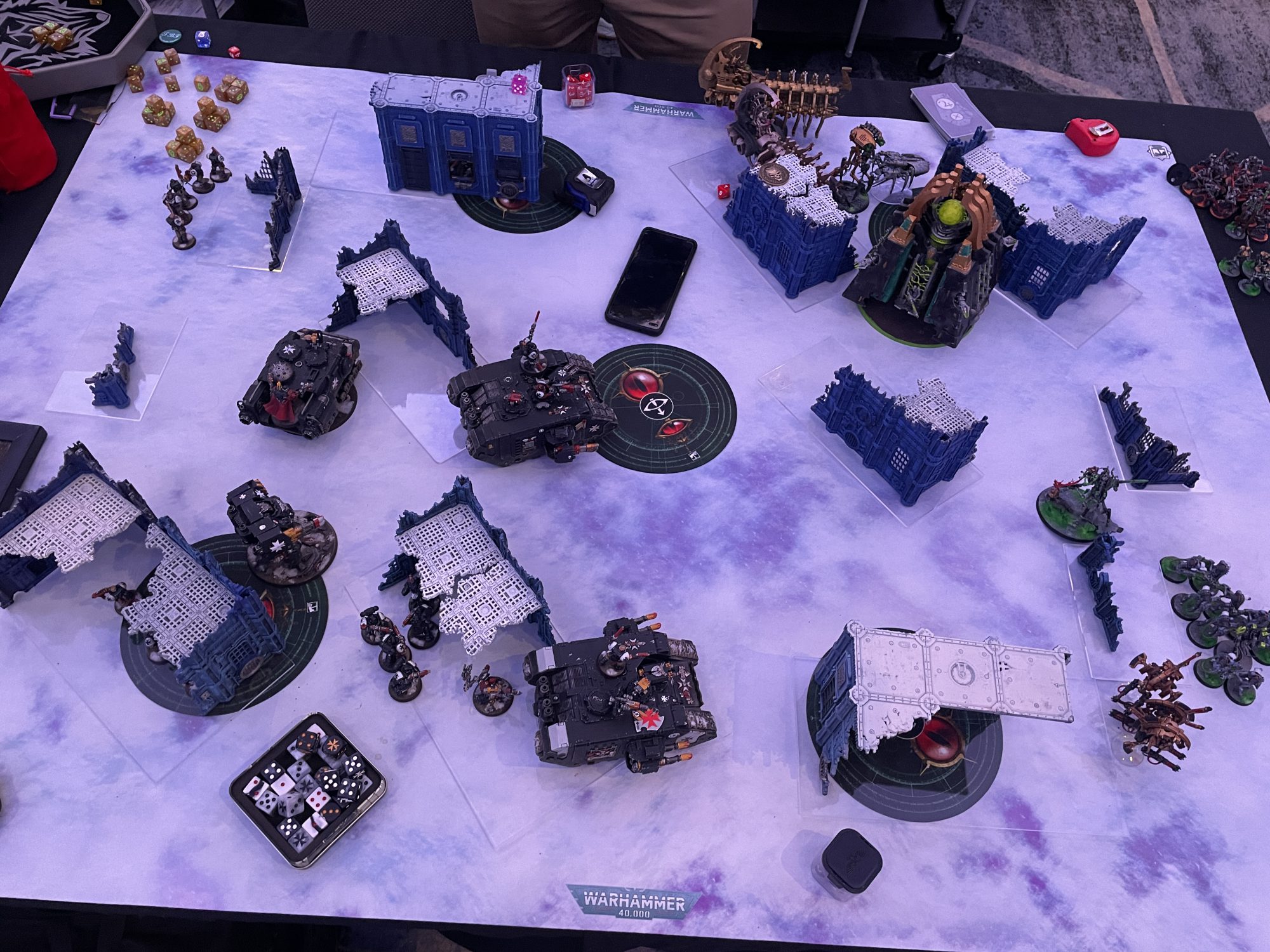 I immediately knew this would be an uphill battle. Sisters aren't necessarily a hard counter to my army, but they're certainly a challenge. Jeff gave me the spiel about his force, with the advice that it's like Crusher Stampede - kill units one at a time, and don't let them become wounded, because they get better once they've taken some damage. I immediately internalized this, rotated it in my mind, then promptly threw it out the fucking window as I proceeded to split fire, leave units at half strength, or shoot piddly little small arms to cause chip damage on vehicles and resultantly power them up. I was stuck in a situation where my troops were forcibly disembarked from their transports in my deployment zone, and seemingly the only time I could roll a 6 was to see if one of my vehicles exploded - which they did - frequently punching holes in my own lines while Sisters miraculously stood 6.5" or more away. This combination of poor target prioritization, messy unit placement, tough matchup, and iffy dierolls came into friction with Jeff's generally pretty good command of his own army, and the toolbox of toys at Sisters' disposal. Some little Palatine can do like 35 mortal wounds in one round on her own, and boy howdy did she. The biggest brain moments of this game involved finding the correct sequence to kill his characters in to prevent them from resurrection. I was lucky when my Land Raider ran over a Battleshocked Canoness, but Morvenn Vahl, a second Canoness, that Palatine, and Junia almost all died - twice. I was able to bounce back to some degree with some good plays, but it wasn't quite enough, and this ended up being the only game all event where I got tabled, with my Intercessor sergeant getting hunted down on turn 5.
