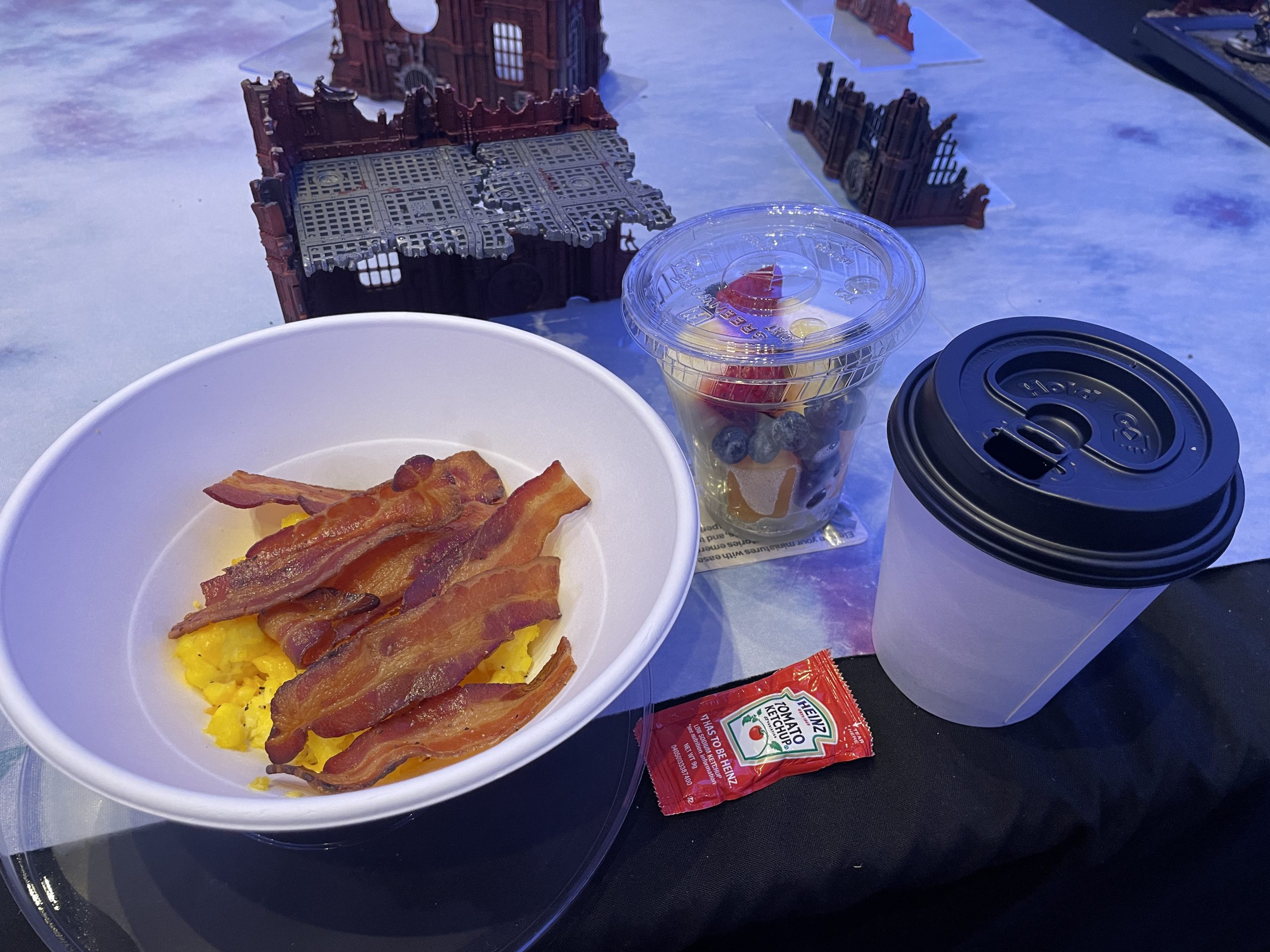 Generator had sprung a leak, so regrettably it was hotel breakfast time. I needed protein something fierce, so grabbed the sad little bowl containing one ladleful of scrambled eggs and two strips of bacon, a 10oz cup of fruit, and bad coffee from a spigot. When I walked it up to the register, they said that would be $40. This bears repeating - that is forty American dollars. I said I would not be paying $40 for this. I can only assume I passed some kind of real-life intimidation check, because they quickly apologized, changed it to $15, and hurried me along. The eggs were rubbery, obviously of the powdered instant variety, the bacon was undercooked, the coffee was burnt, and the fruit cup was mostly honeydew melon, the sawdust filler of the fruit world.