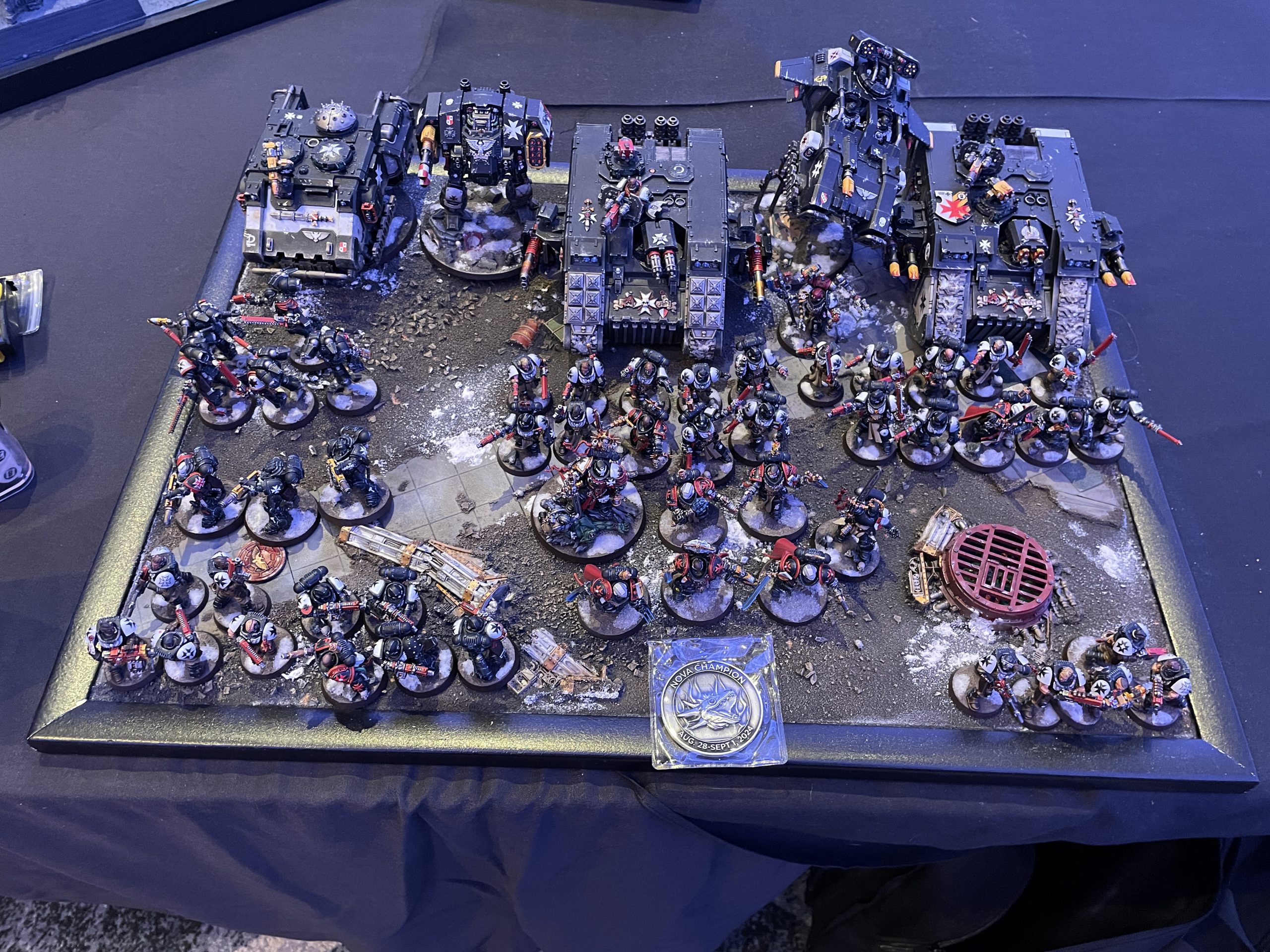 Around this time I was also given a little silver medal for my army. I didn't make the very top cut for my army, but still got that recognition which I was happy to see. I figured I wouldn't be winning best painted in all of the GT and though I'm confident in my abilities, I know there's always a bigger fish. There were a few displays I scrutinized the night before where the boards were huge and impressive but the armies were maybe a bit unfinished or underdeveloped, but there was definitely one or two where I audibly said "oh fuck off" at how impressive the display was. Making a big ol' display board is all well and good, and I hugely appreciate the model railroad/military modeler aspect some of them take, but if the models aren't to the same standard, it's not going to hold up to any sort of scrutiny. This is where I'll say my board is good but not exceptional; made for a