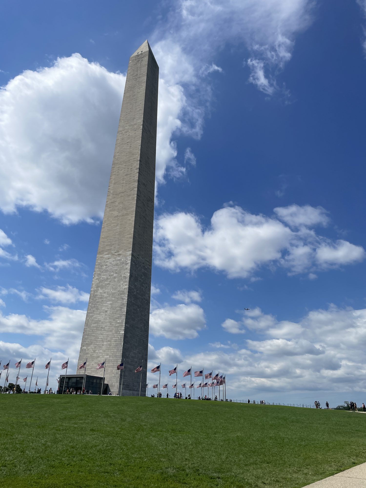 We walked to the Washington Monument, braving the beating sun until we could finally stand in the shade of our favorite local obelisk. The place was chockablock full of tourists - of which we technically were - and people just happy to be out and about. I was tempted by the ice cream trucks on every corner. Something about a modestly deformed