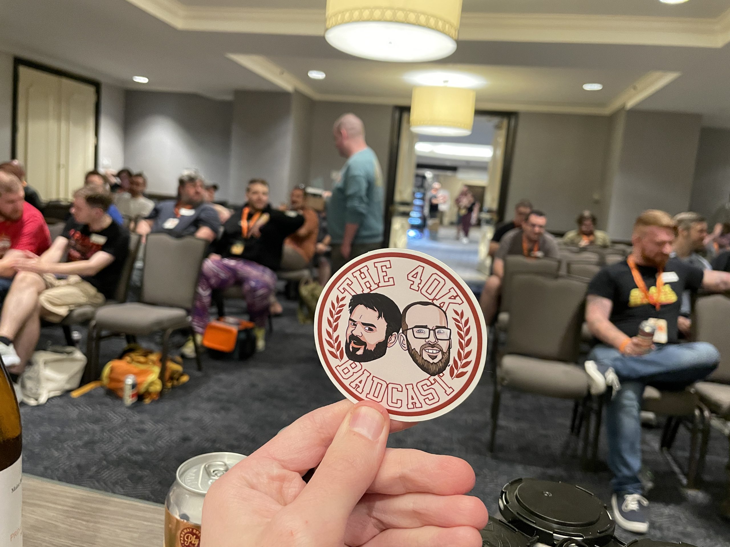 Shaking off the bad vibes of the day's gaming, Dan and I headed up to a creator meetup in a room on the 10th floor. It was deafeningly loud, with far more people in this small suite than it could reasonably hold, but it was packed with familiar faces from NOVAs past and present, as well as my browser history. I got to say hi to Brent from Goobertown Hobbies and congratulate him on his sick little