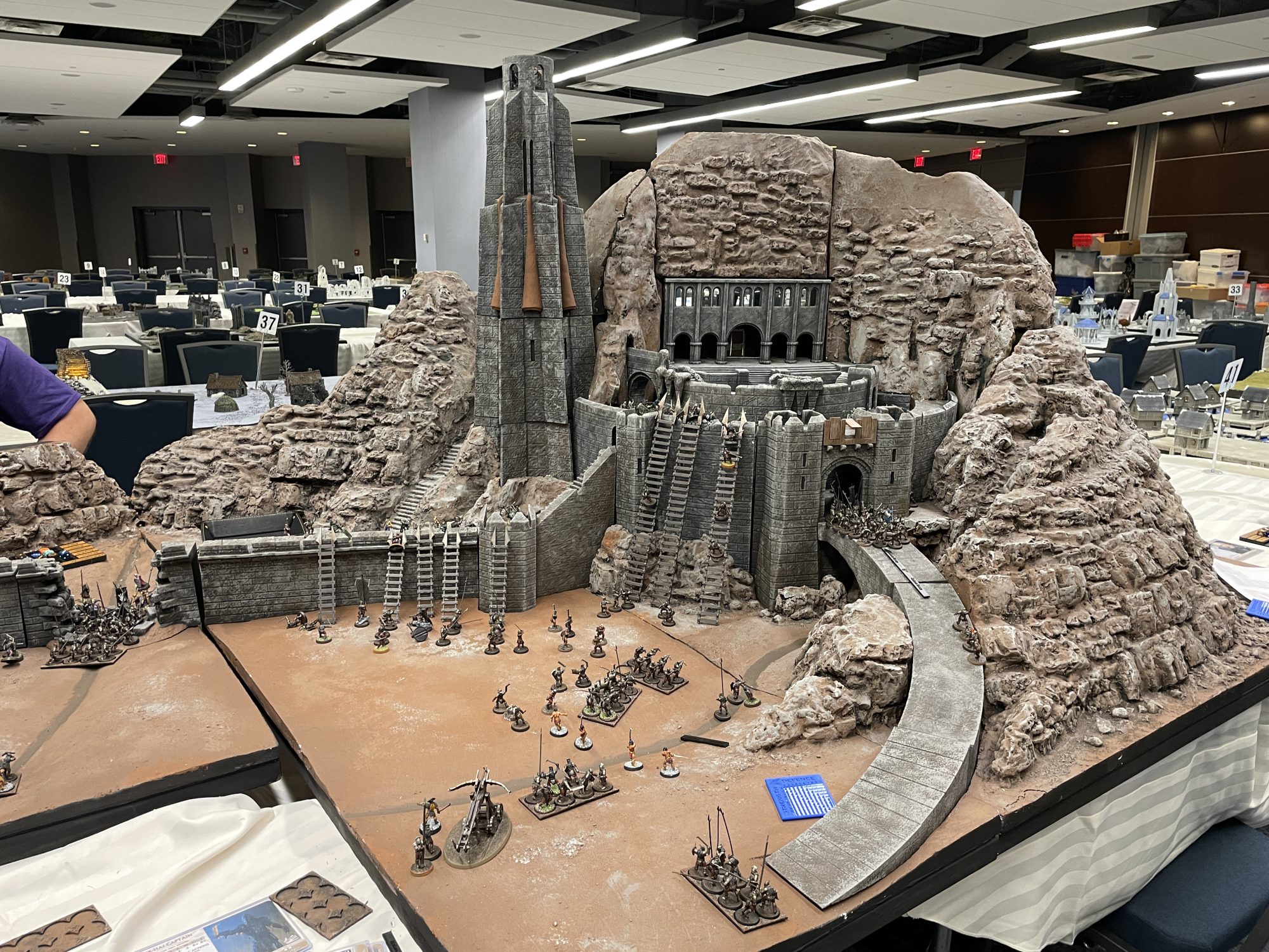 With an open schedule and an open beer, today was a good time to wander the halls. I checked in with the 40k Narrative crew, running into some old friends like David and Spencer, and just admired the gonzo boards they were all playing on. The staid and stodgy 40k GT terrain is a hundred times more playable, but the narrative boards look a hell of a lot cooler, that's for sure. The only boards that hold a candle to them are those in the Lord of the Rings zone, where I spectated the Battle of Helm's Deep for a few. Aragorn had been blown up when the Uruk-Hai sapper hit the wall early on, so I'm guessing there's not gonna be a third book in this particular version of the
