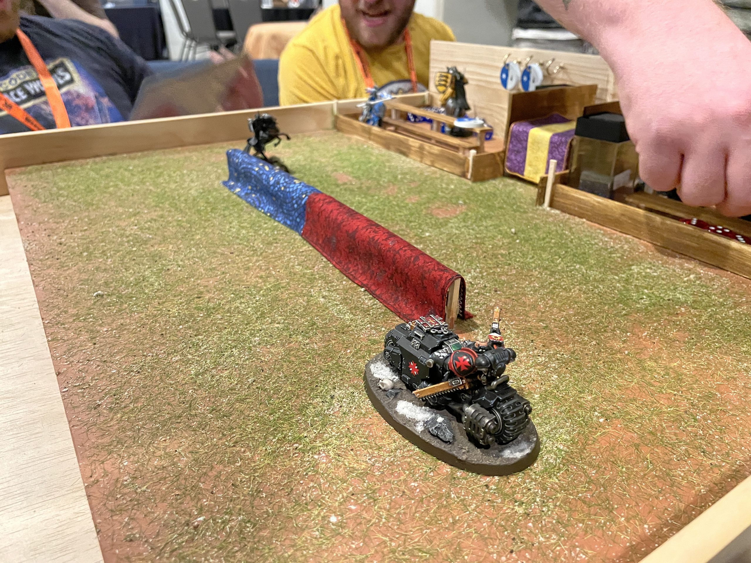 wouldn't you go all out and make a show of it? Ken brought out his tilting yard and officiated as we broke into teams of jousters. While there were mounted Brettonian Knights to pick from, we were encouraged to bring our own riders. Naturally, my Outrider sergeant Antillochus was my pick. In my first tilt, he rode against Will's Witch King of Angmar. With cool precision, Antillochus cocked his bolt pistol to the side and capped the Witch King immediately. We're really rewriting Tolkien's work today at NOVA. Alex followed up with his JoyToy Outrider, and I'm pleased to say the wheels on that giant motorcycle actually turn, which elicited no fewer than one (1) gleeful fit of childlike laughter from the gathered players. Our team won our jousts pretty handily, and in the next round my biker was paired against another, smaller biker: Nick's Squat tricycle rider. Clearly my sergeant didn't aim low enough as he completely beefed it and was promptly dismounted, losing instantly. Last year may have been more raucous than this time, but I was just happy to hang with my crew and roll some dice, the outcomes be damned.