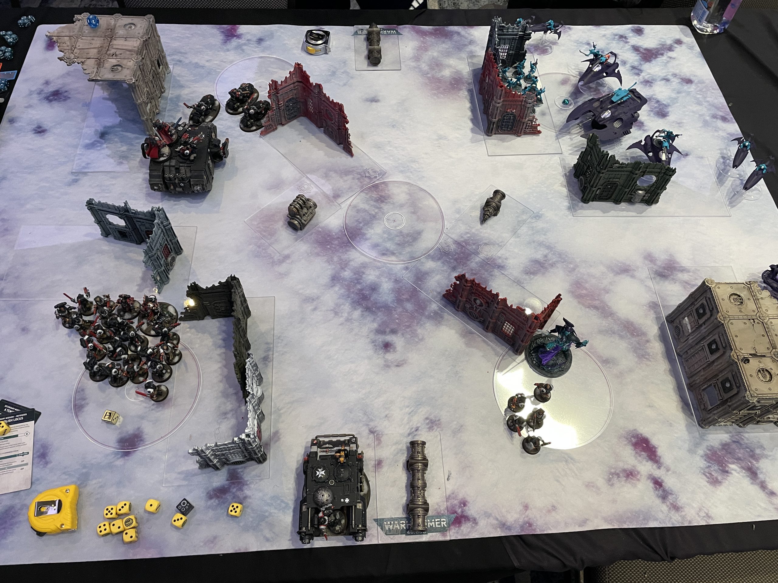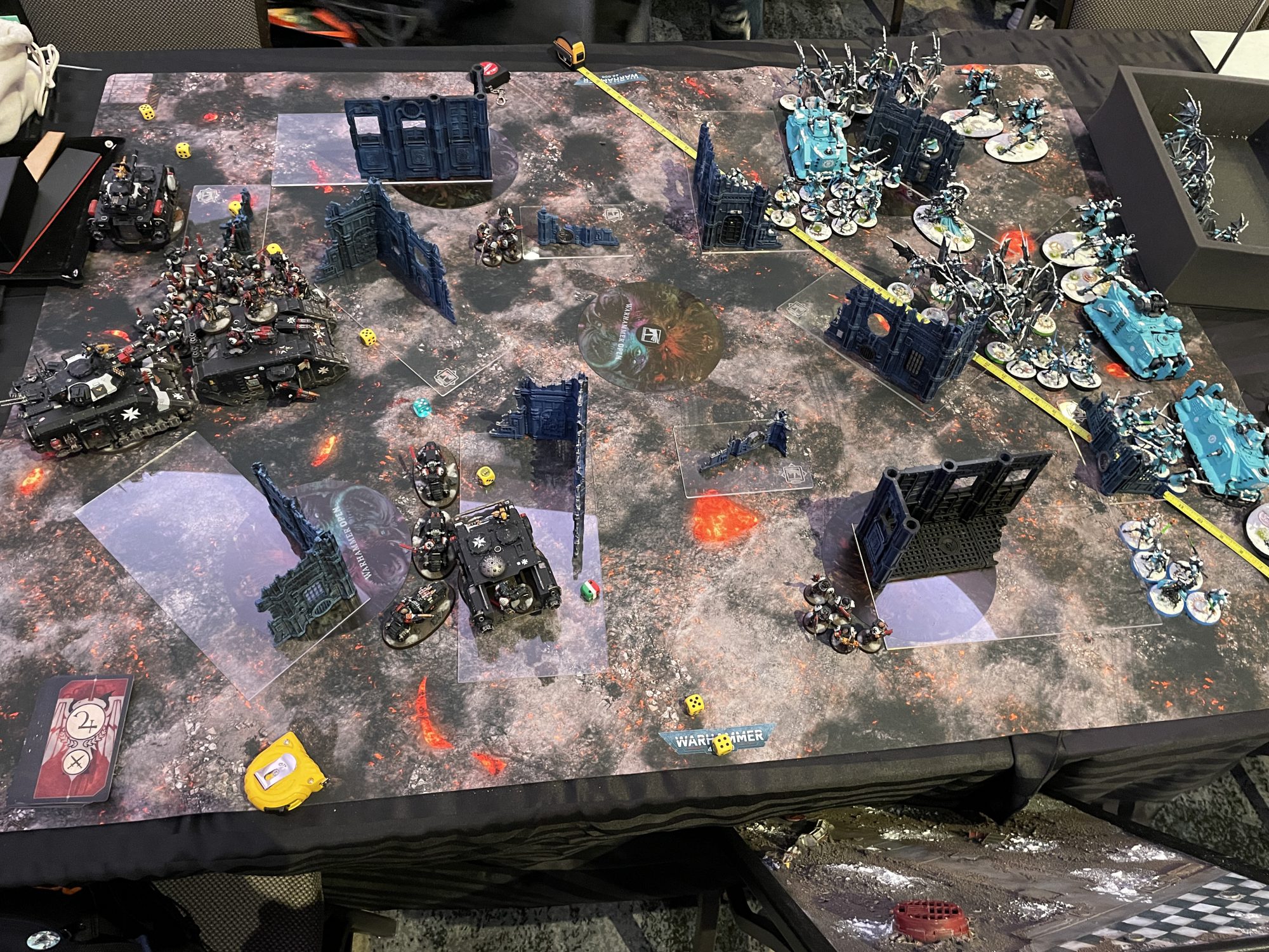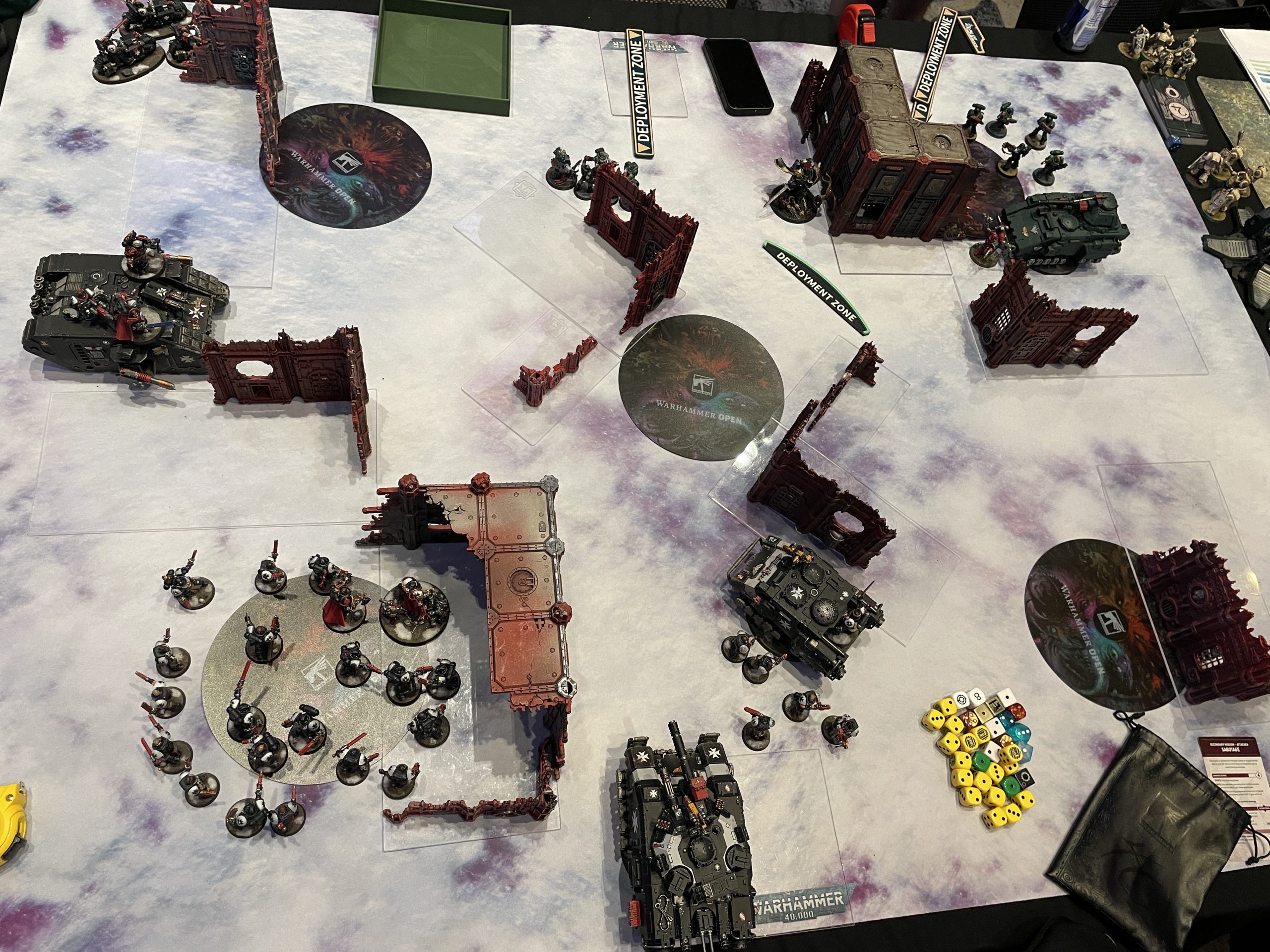 It was a new day, and my only goal was to ensure I stayed out of the 0-5 bracket, a shame that would follow me to my undoubtedly early grave. Simon immediately struck me as a genuine good dude, and we got off on the right foot quickly. This could be a tricky matchup for me, as his whole army's gimmick is durability that could easily stonewall an assault army, but my +1 to wound vow would come in handy here. It also doesn't matter how hard it is to wound you when I'm getting crit lethals on 5+, something that would help me out immensely against his non-Deathwing Knight units. After I played things safe on the first turn, he had The Lion roll up into the center of the board for a Cleanse action, which struck me as maybe not the best available move for him. While The Lion has Lone Operative near other units, that didn't help him when my RepEx rolled up and point blank laser cannoned him in the face. My armor park held down the center of the board while he tried to pick apart my units on the outskirts, but this time it was someone else's turn to fail a charge, and his Inner Circle Companions were stuck near my Sword Brethren, who were able to whittle them down before charging in and finishing off the squad. His units of Deathwing Knights were able to bully my shitty little Gladiator and get a charge out of deep strike into the Helbrick, but with enough CP for my fight on death stratagem, that 20-strong Crusader squad was able to actually hit back with some serious force, all while surviving that initial Knightly onslaught. All that was really left was Azrael and a brick of Hellblasters in his backfield, but the Emperor's Champion and his Assault Intercessors were able to charge those boys down, and this game went firmly my way.