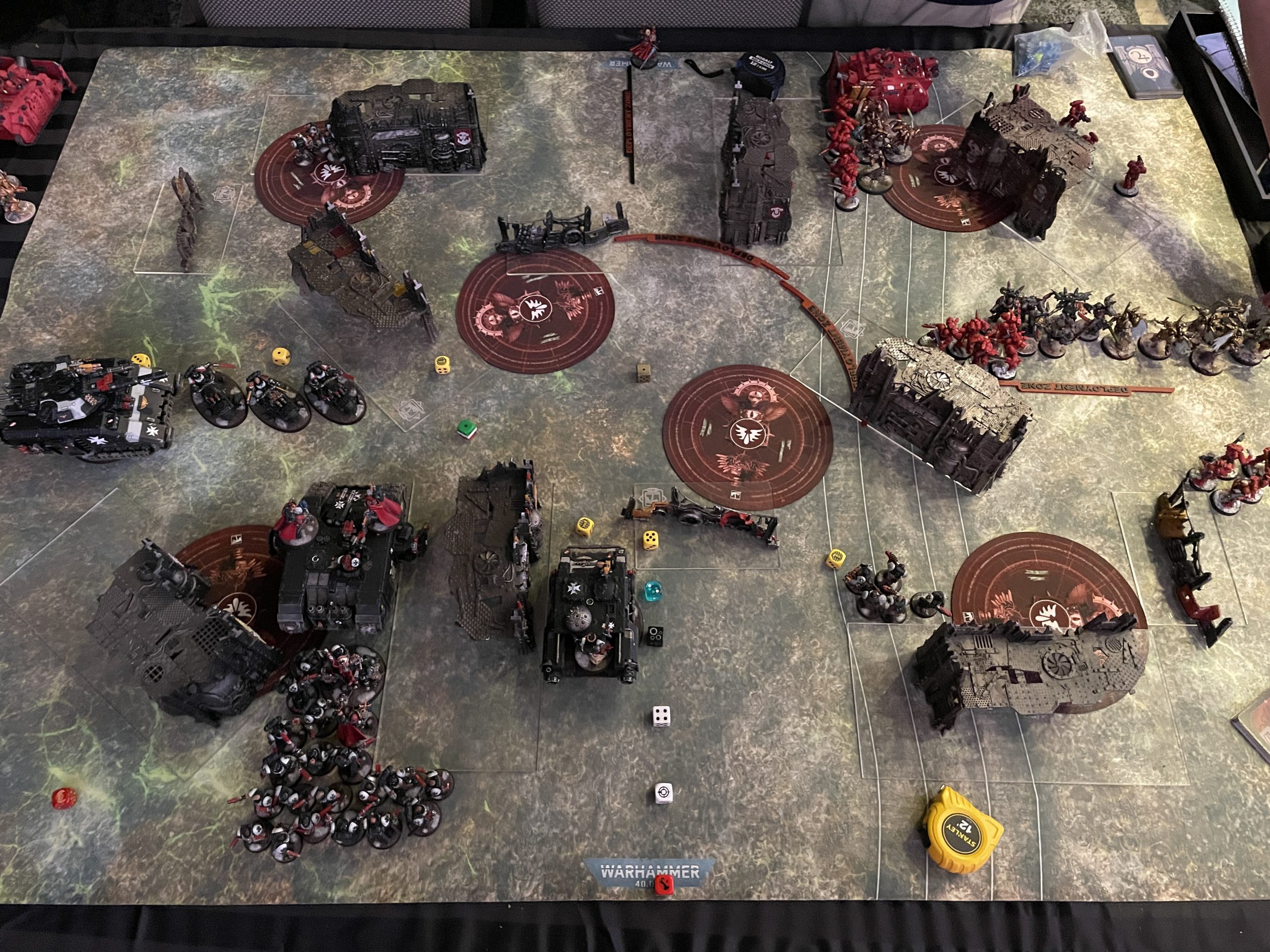 I don't know how I always end up into Chaos Daemons, but here's their second showing for me this event. This is the rare mono-Khorne build, loaded with Bloodthirsters, Bloodletters, Khorne Dogs and Skarbrand. With two melee armies on the table, this was liable to be a quick game. Russ fulfilled that prophecy on turn 2 when he dropped everything in his army down and said "this is the part where I flub my charges" and flub he did. Of the 5 charges he attempted, I think he made 2, neither of which were entirely too impactful. Even his Bloodthirsters weren't able to fully crack my transports, and when they did, that just meant the dudes inside could hop out and charge in my own turn. My turn 2 I clapped back with everything I could, largely clearing the board of his big threats through giant laser cannons or sheer weight of chainsword attacks. Our game was effectively over on turn 3, when I'd mostly cleared his daemons off the board. It was a shame our game ended so quickly and due largely to some bad charge rolls, as I really enjoyed my time playing Russ. He's the dad of one of the folks from Tabletop Titans, and I always enjoy my games with people who've shepherded the next generation into gaming. My dad brought me into this space with historicals back when I was a kid, and I like seeing how that same dynamic can play out with other folks. We didn't have time for the deepest conversation in the world or anything, but I value having that intergenerational connection, even if it is only over toy soldiers.