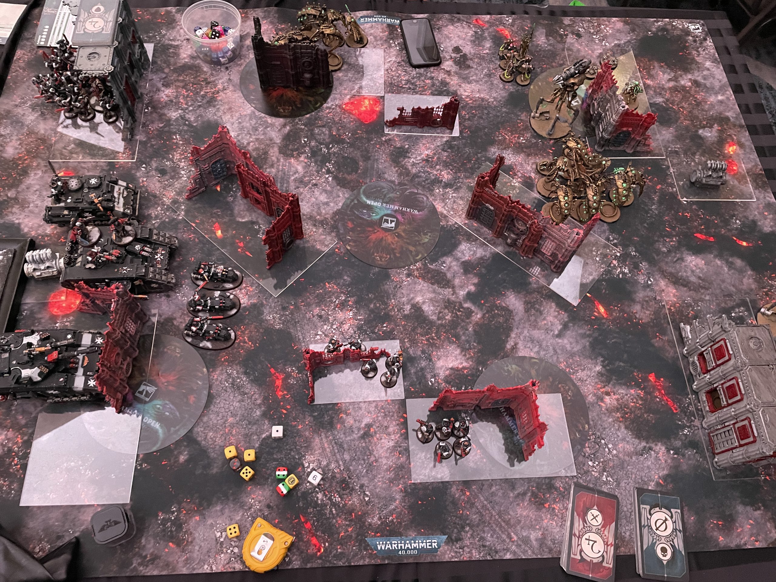 While this is historically one of my worst matchups, I felt confident going into this game. Generally when I see handwritten note cards reminding a player what their army does, I feel like I'll have the upper hand. This is where I have to dash your dreams and mine, as I did not have the upper hand here. While early turns were largely built around positioning and trading some cheap screens, he took ownership of a good chunk of the board's objectives. In doing so, I was watching him make big, obvious mistakes, exposing units that would easily be killed by my assault and shooting units, and I had clear plans on how I would pick each one apart. Yeah, Be'Lakor and a bunch of greater daemons are sitting on objectives in the midfield, but that's right where I can charge them, clearing them off so I can rack up points in the latter half of the game. Unfortunately, my dudes left their mass-reactive bolt rounds and chainswords at home in favor of rubber bullets and foam LARP weapons. In one particularly frustrating moment that is etched permanently in my mind, my Sword Brethren charged his already damaged Soul Grinder, scoring a hefty 14 wounds. If just 4 of those attacks got through, I'd kill the thing, take the central objective, and have the upper hand. He then passed 12 out of 14 4+ invulnerable saves, swung back and killed my unit, regenerated a bunch of lost wounds, and proceeded to roll through the game. This was no isolated incident, and was echoed in every turn, with every unit, and every part of the board.