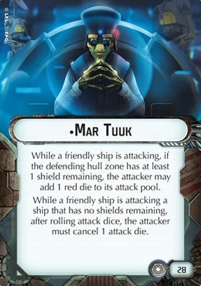 and side arc on a target so it can attack twice in one round. His ability can be used once per attack, so there's benefit to getting more hits in. He goes great with the Fleet Starter because that pack adds many more ships. More ships means more attacks for Mar Tuuk. He's like Obi-Wan in that respect - his ability is universal enough that it won't go out of style if your collection expands.