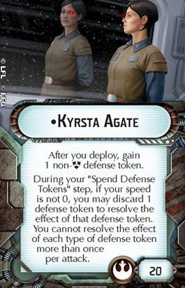 Commodore Agate is the first of my lots-of-text recommendations. She's also a two-parter. Her first rule is a one-sentence affair: after deploying her ship, it gets one non-Scatter defence token. Simple. Importantly, this rule doesn't complicate her second rule because it's not required to set up her second rule the way Thrawn does. It's just there to make her ship tougher.