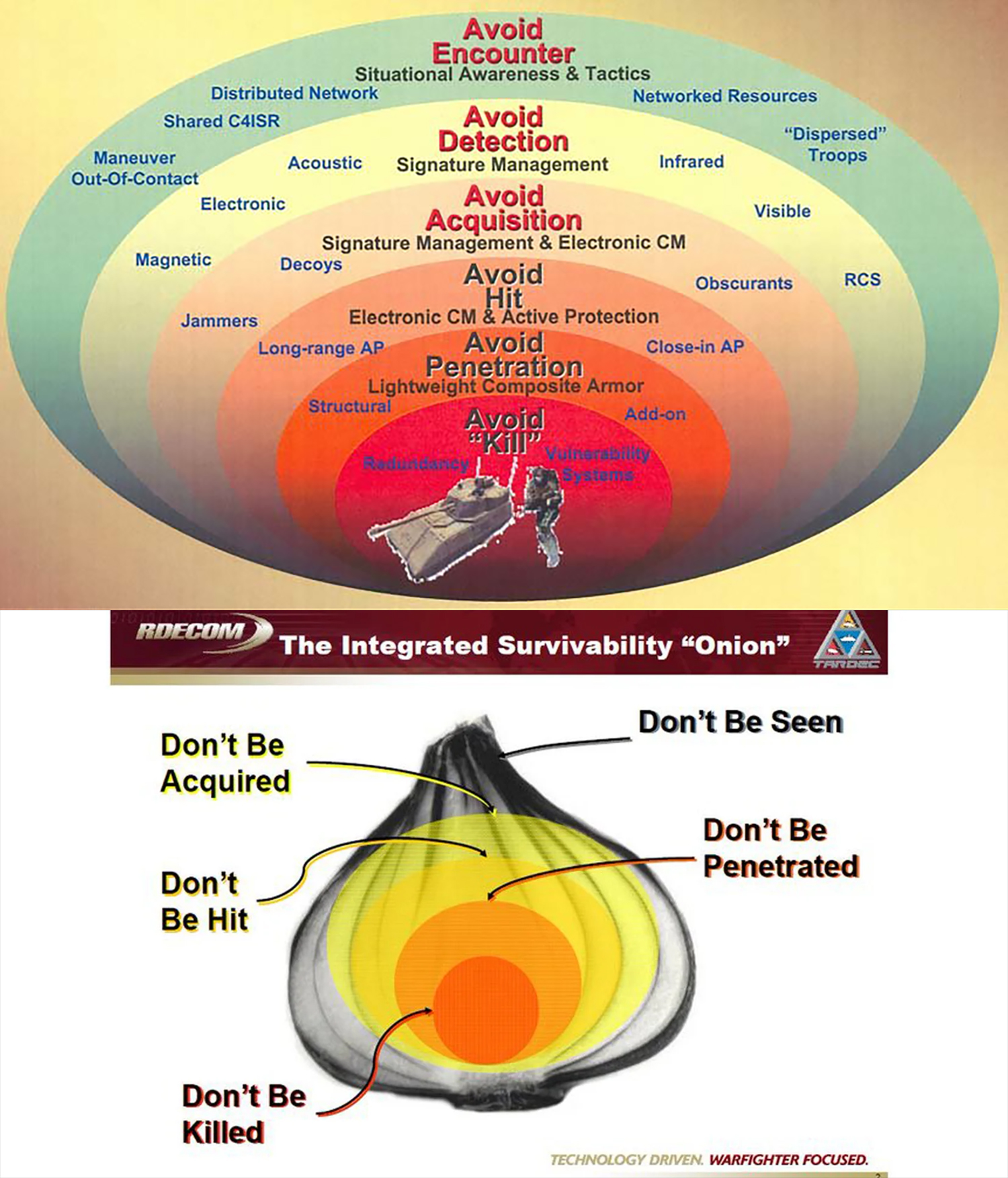 The integrated survivability onion encourages us to stop fixating on armour protection and taking hits as the main mode of survival. Instead, it identifies the numerous opportunities for defence that present themselves