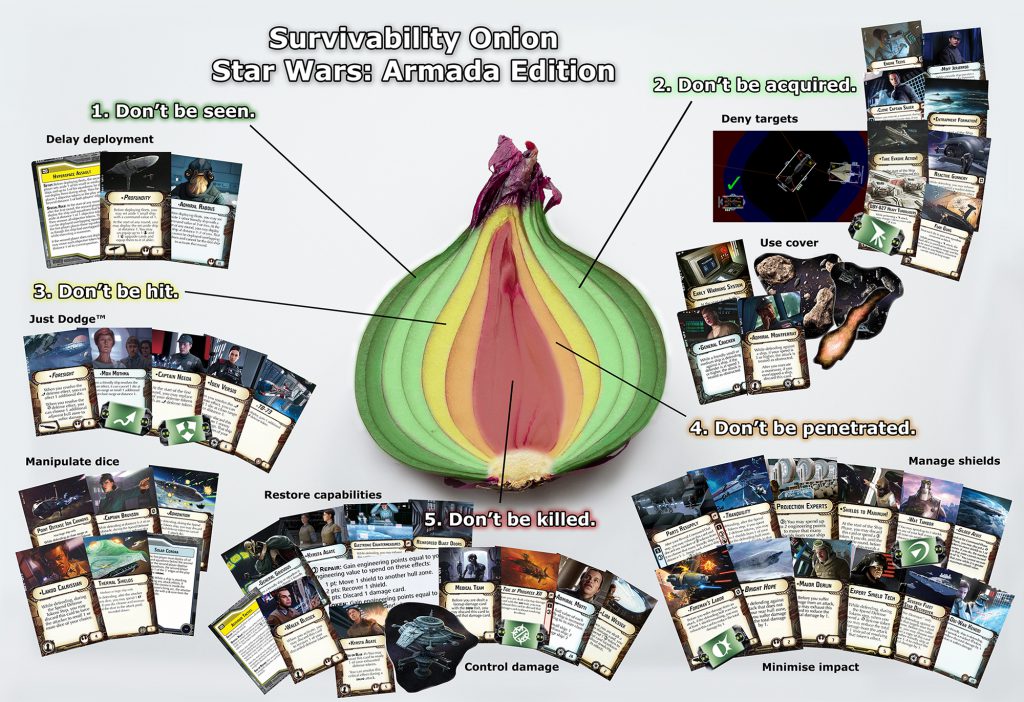 even more fun, I’ve adapted the integrated survivability onion into a diagram that can be applied to Star Wars: Armada. Because we’re not dealing with C3, jamming, and networked battlefield management. This isn’t the Pentagon. It’s