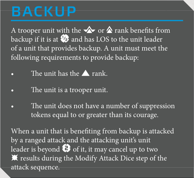 The existing cancel 1 or 2 Hits system of cover has been replaced with a rolled save system. A unit in cover can now roll a white defense die for each Hit in the attacker's pool. If the unit has light cover, each Block cancels a Hit. If the unit has heavy cover, a Block or Surge cancels a Hit.