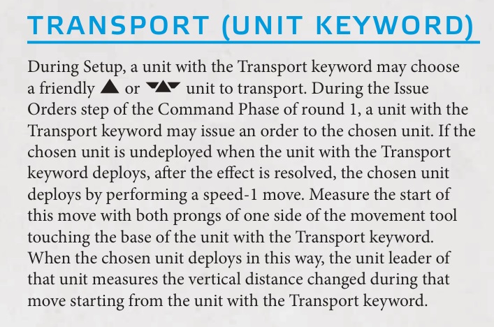 many words to describe a forward-deployment ability for the units inside. Units that are transported can get ahead of the competition (by a fair distance, too). But they're asked politely to disembark in Round 1. There is no re-embarking or using the unit from inside a transport.