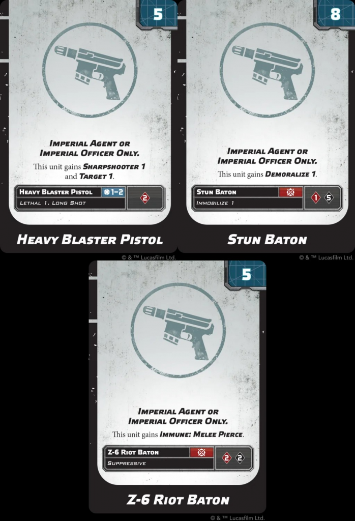 Retinue to a corps unit allows this Agent to pair up with a corps unit. A Stormtrooper Riot Squad seems like a good choice to get a small strike team melee-based duo together. Gaining Surge:Crit and Surge:Block when engaged means you're likely going to give the Platoon Commander one of the melee weapon choices. The unit usually has surge:block, but if you give the Agent the combat armour you now have a red save unit which has surge:block. To double down on this defensive tech, if you give the unit the Z-6 Riot Baton it also has
