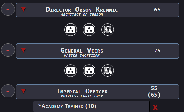 Inspire 2 mean that the army around the Officer can continue to work as planned without too much disruption from suppression. I can still find lists where Krennic or Veers could fit in. Krennic likes Deathtroopers and