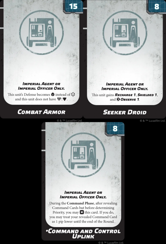 Observe 1 is a nice bonus. Even though both the Officer and the Agent have two Gear slots, one is always going to be filled with something else as we shall see shortly and there are other more viable options than the Seeker droid in some builds. The Command and Control Uplink upgrade is restricted to just one-per-list (fortunately). It's probable that this upgrade is going to start appearing in the vast majority of Imperial lists! It allows you to reduce the pip of a command card for one round in a game. This means turning a 3 pip into a 2 pip or a 1 pip into a 0 pip! This doesn't have to be played on the Agent's of Officer's own command card and can be combined with