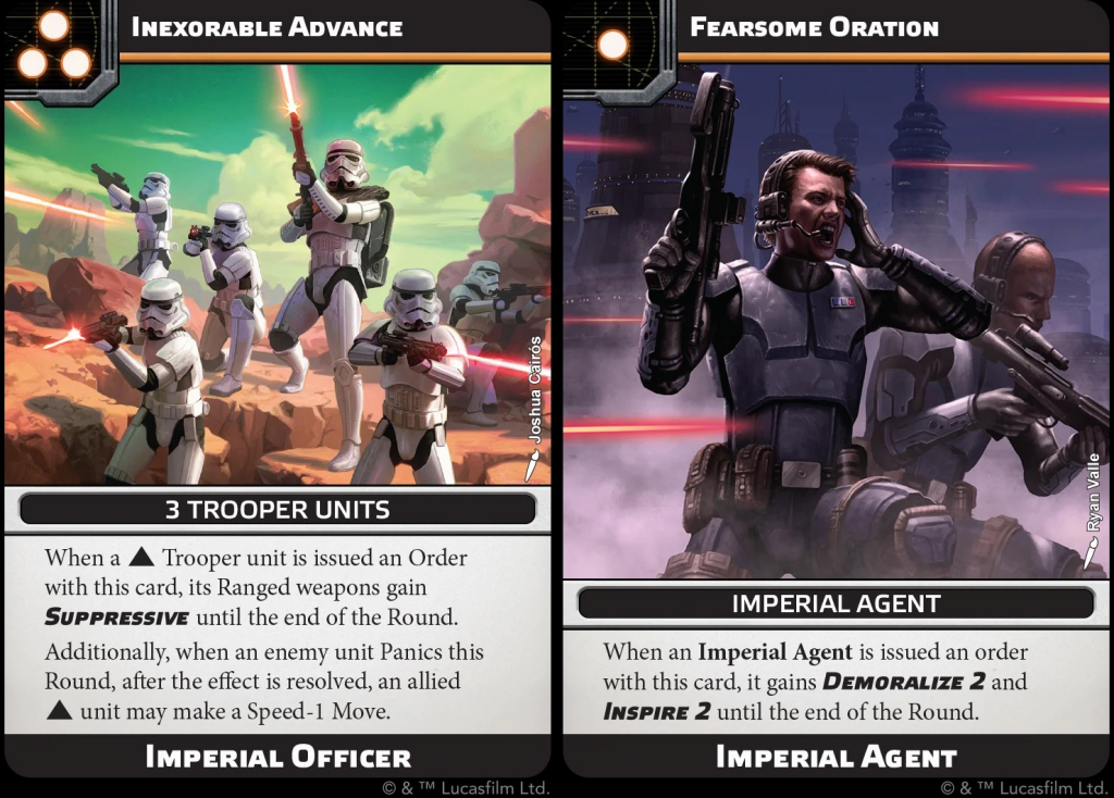 Aid, which allows it to give that aim out to another trooper unit at range 2 at the cost of a suppression token. I can certainly see units with this doctrine being used as aim factories, which could see the suppression tokens stacking up. However, this can be mitigated somewhat by the text at the top of the card, as when issued an order a unit within range 1 may remove up to 1 suppression - including itself. I could see a variety of good pairings with some of the Empire's corps units: