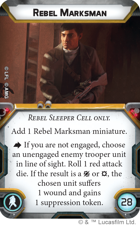 For 5 points, you can include an R4 Astromech. This is a great upgrade as it continues to stack Dodge tokens on the unit, and synergizes well with Nimble. For 28 points, you can add a Rebel Marksman to this unit. Not only is the model cool as Hell, but I think this marksman works well with what this unit wants to do, which is disrupt enemy plans and not be engaged.