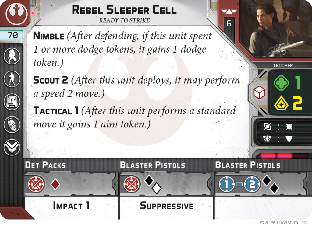 The Rebel Sleeper Cell is a 70-point Special Forces unit that starts with 6 models without any upgrades. They have an envious red attack dice with their Det Packs in melee that also has Impact 1 if you’re facing more heavily armored opponents, or a black dice and a white dice if you’re using their Blaster Pistols (which also have the Suppressive keyword). They can also shoot up to Range 2 with their Blaster Pistols and roll 2 black attack dice. This unit is meant to be mobile and have a large impact when it chooses to strike, and the rules on its card help that translate to the game. They convert surges to hits and blocks when attacking or defending, and with Nimble and Tactical 1, this unit will always have a Dodge token and will almost always be able to get some hits through thanks to gaining an Aim token after it makes a standard Move action. They can also move into position early in the game with Scout 2. Like a lot of Rebel units, they are incredibly fragile with white defense dice and only 1 Wound per model, but will still be rather tough to move with 2 Courage..