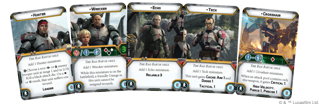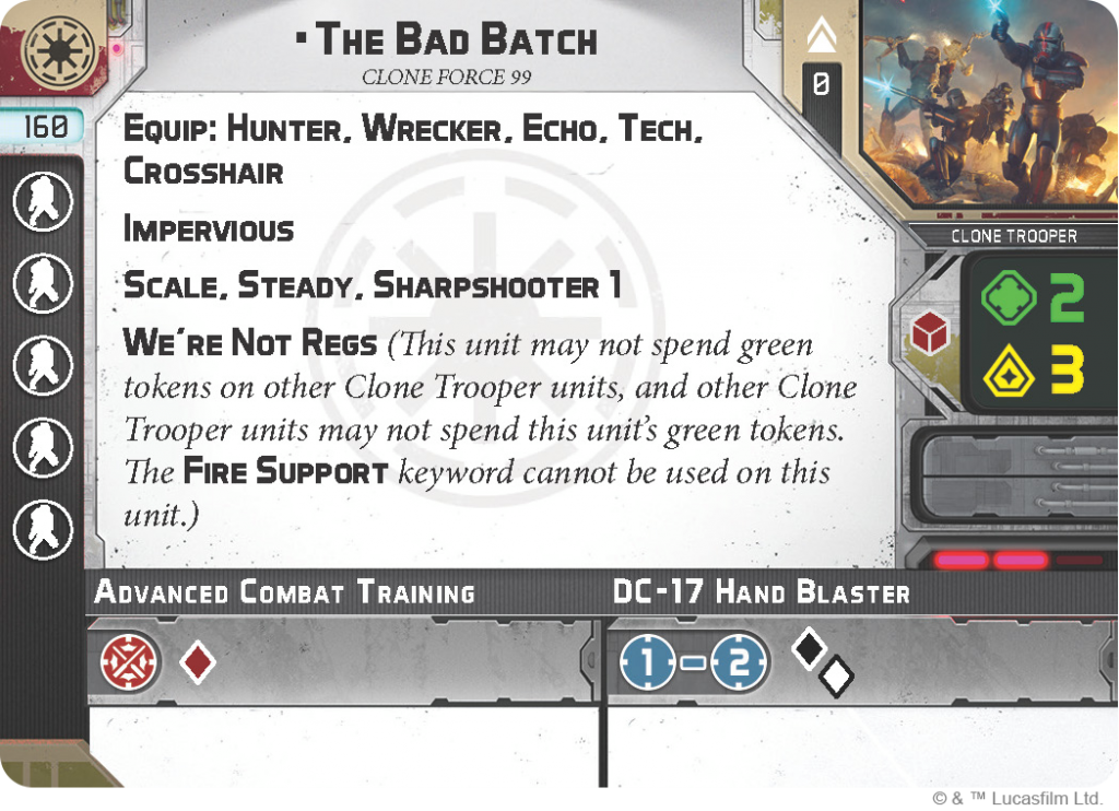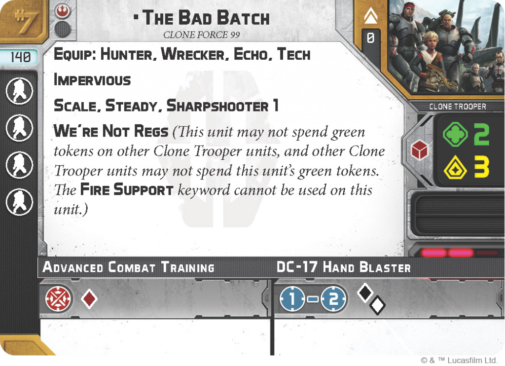 This is a very elegant solution to questions I had about this unit in Legion. Each of these characters are very different individuals, but they also work really well as a unit. How would this be represented? Well, to begin with there are TWO versions of this unit: the 160-point GAR version and the 140-point Rebel version. You lose Crosshair for the Rebel version, but for 10 points, you can add Omega. For both versions, the only upgrades you have are the remaining members of the squad, and you have to equip them, with each one adding different bonuses to the overall performance of the squad. At a base level, they add 1 Red attack dice in Melee, and a Black and White attack dice from range 1-2. They also have 2 Wounds, 3 Courage, and roll Red Defense dice. They also have the keywords Impervious, Scale, Steady, Sharpshooter 1 and can’t use other Clone Units green tokens, and other Clone Units can’t use their green tokens. They also can’t use the Fire Support keyword. Each individual adds the following: