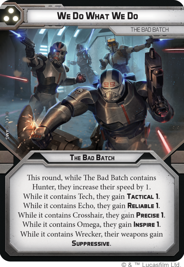 There is really only one unique card to talk about with this unit, because the squad members are the only upgrades you can equip. However, they do have a fantastic 3-Pip Command Card We Do What We Do. In my opinion, regardless of the version of the Bad Batch you are taking (GAR or Rebellion), this card is an automatic include. It’s that good. The round you play it, you gain even more keywords to benefit the squad. They gain an additional Tactical 1, Reliable 1, Precise 1 (with Crosshair), Inspire 1 (with Omega), their weapons gain Suppressive, and their speed is increased by 1. When you absolutely, positively need this unit to do something, you play this card.