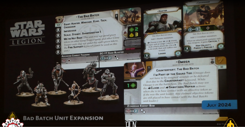 The Bad Batch are coming to Legion in July, with a unique squad composition. Every member of the Bad Batch, barring Omega, is represented as a free heavy weapons upgrade that you equip to the unit to give it special rules related to that member. For example, as seen in the screenshot, Crosshair adds a red die to your attack pool as well as a ton of keywords, while Hunter can deal damage directly to a unit at close range. The Bad Batch will be able to be used as mercenaries in Rebel Alliance armies, letting you play them across factions.
