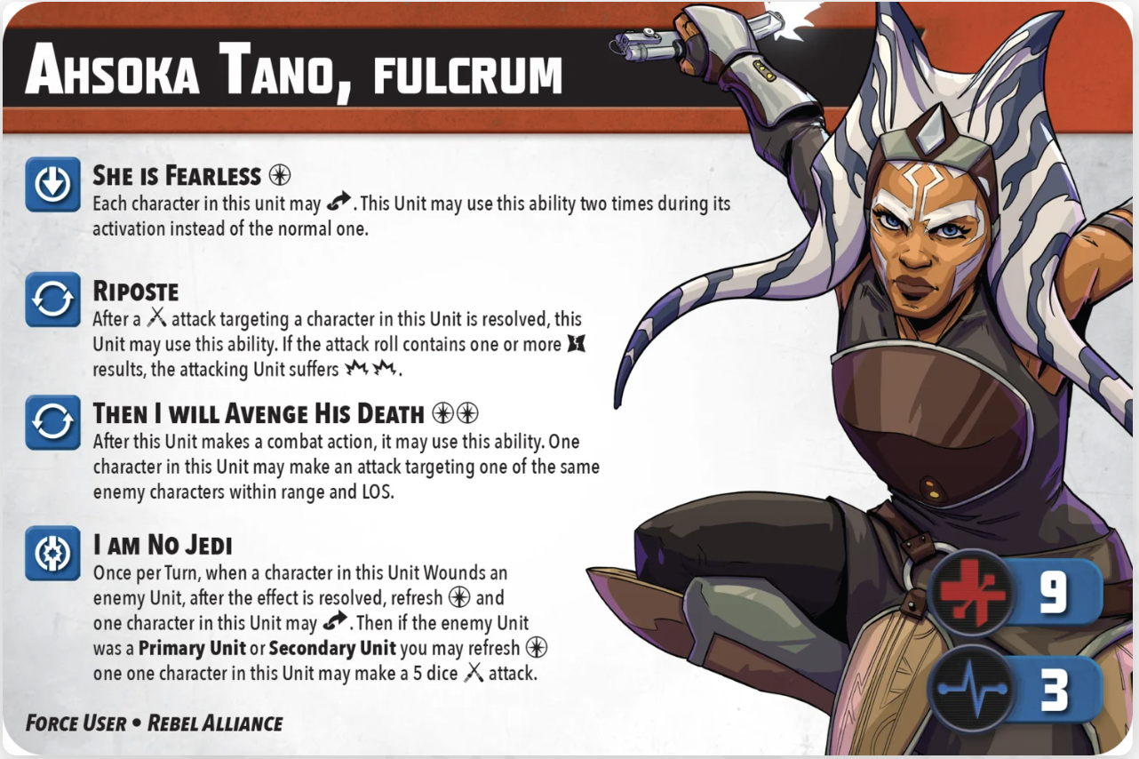 Ahsoka comes in with a nice set of stats- 8 squad points and 4 force is excellent. No complaints, and befitting of a talented and resourceful force-user. She is era-locked to the Age of Rebellion, for entirely appropriate reasons.
