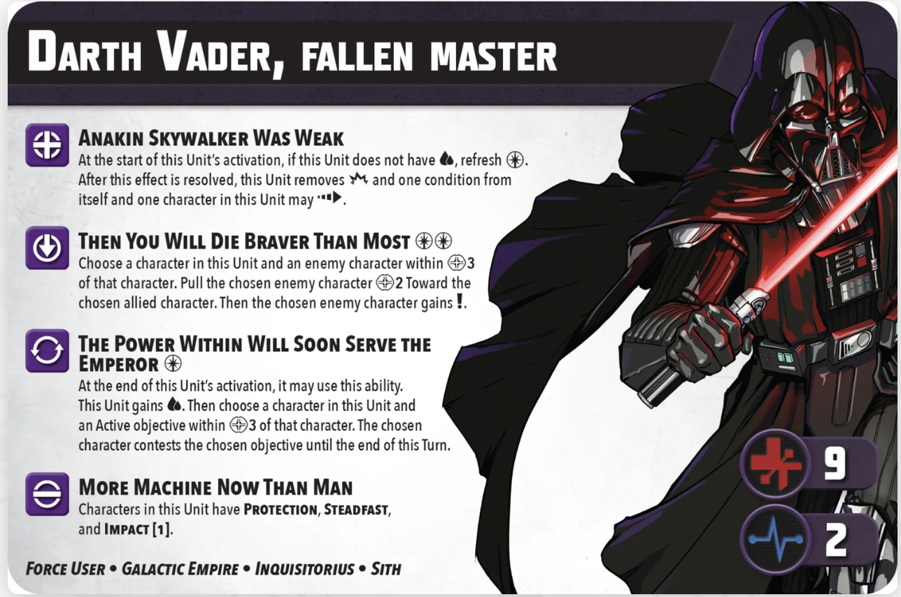 There’s a lot going on here! First of all, his tactic (Anakin Skywalker Was Weak) is strong. If you’re not strained, you refresh Force. Force refresh is always good. After you check that effect, Vader gets to remove a damage and a condition from himself and make a dash (which your opponent can’t prevent by Pinning him, as he can remove the condition first). That’s a lot of good stuff all in one place (incidentally, you’ll also remove the strain, because you’ll take damage from the dash per the usual strain rules!).
