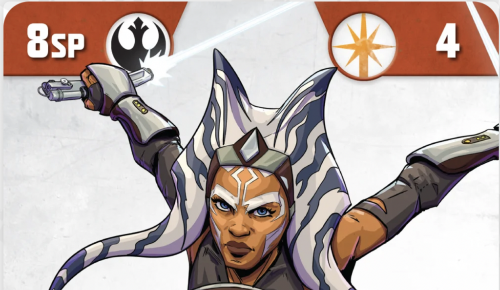 First of all, let’s talk about the narrative here: this model design is an A- for theme. She is a really interesting combination of her younger forms, her master Anakin, and even a tiny nod to first teacher Plo Koon in her stance cards (like Plo, she has a combat tree in one form that splits into a pin/disarm branch or a heal-focused branch). The big miss is the lack of the Spectre tag; the only times we see Ahsoka in this version, she is working with the crew of the Ghost, and it would really have been nice from a gameplay perspective to give her the ability to trigger off those Spectre abilities.