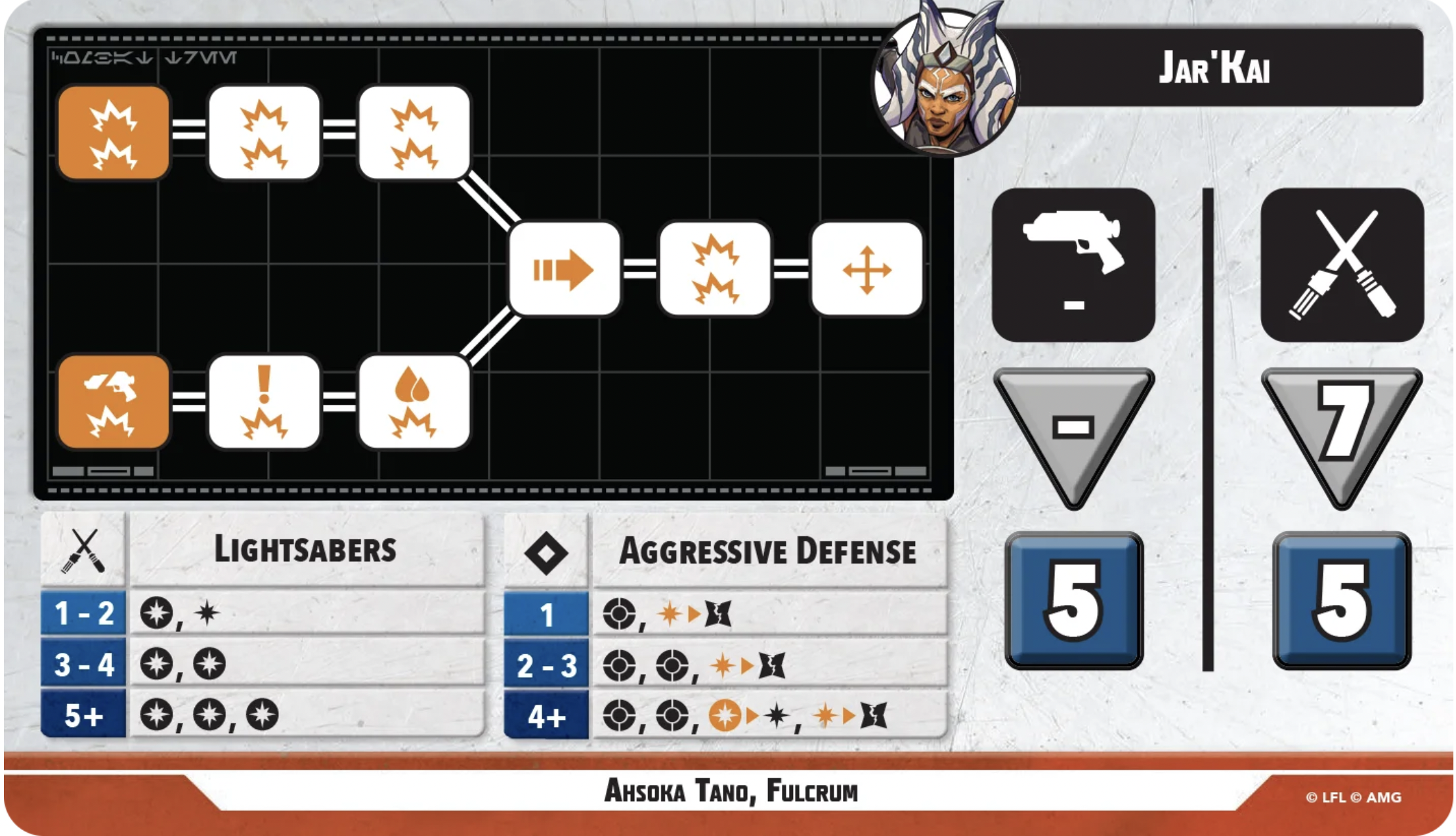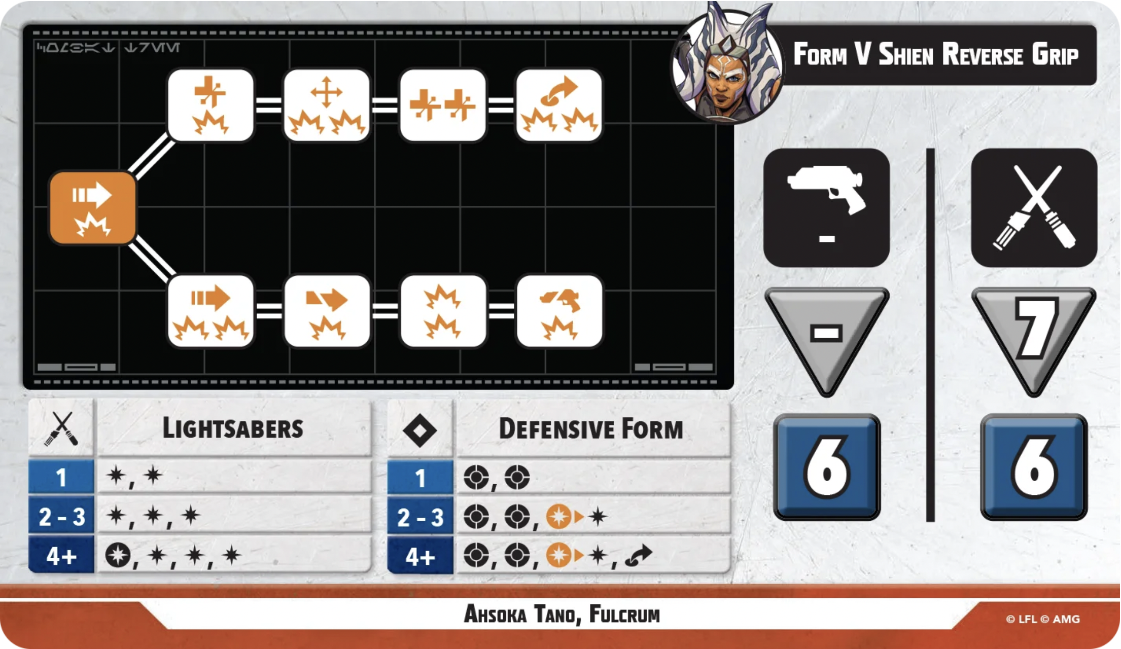 Form V Shien Reverse Grip is Ahsoka’s positioning/healing stance, giving easy access to shoves, healing, loads of movement, and respectable if not outstanding damage. Her offensive expertise here is just all about favorable exchange rates, at a 1-1 expertise to successes ratio or better. It does not have much in the way of crits, however, so you’re really banking on just overwhelming your opponent’s blocks by sheer weight of results. This side also gives her six defense dice at both range and melee, and her expertise is solid, with a good conversion rate and crit mitigation, as well as an annoying jump on 4 that definitely can’t be relied upon but should make your opponent worry.