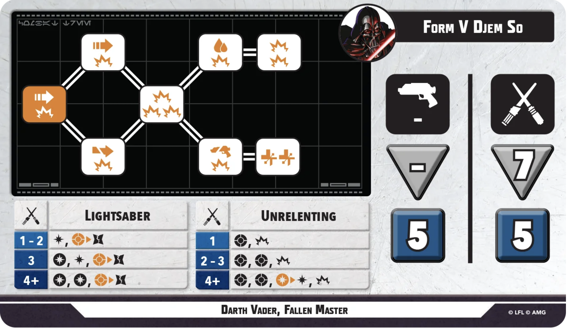 Form V Djem So is…fine. 7 dice is pretty solid, if not flashy. The Offensive Expertise is all right, though it converts at a little below 1-1. Block to fail is a cool effect, but there will be those rare times your opponent doesn’t roll any blocks, and at that point you’d rather have another hit (which would cancel a block anyway). The Defensive Expertise is also OK, converting at a bit below 1-1, but with the added wrinkle that often any opponent with only one health remaining and no recovers on their combat tree simply cannot attack Vader for fear of immediately being wounded on their own turn. This is niche, but the psychological effect there is good. One damage here and there incidentally isn’t anything to sneer at, either- one of the strongest models in the game right now is Cassian Andor, whose This Town is About to Blow ability is super effective at dealing chip damage to take models below the threshold where they’re likely to be one-shot on subsequent attacks. Vader’s Defensive Expertise can have a similar effect, although of course it’s nowhere near as strong as Cassian’s ability (and shouldn't be).
