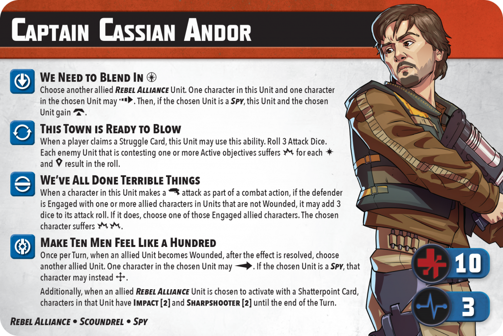 In Shatterpoint they are the Primary unit in the “This is Rogue One” squad pack which is focused around the Rebel Alliance, Scoundrel and Spy keywords, all of which she has.
