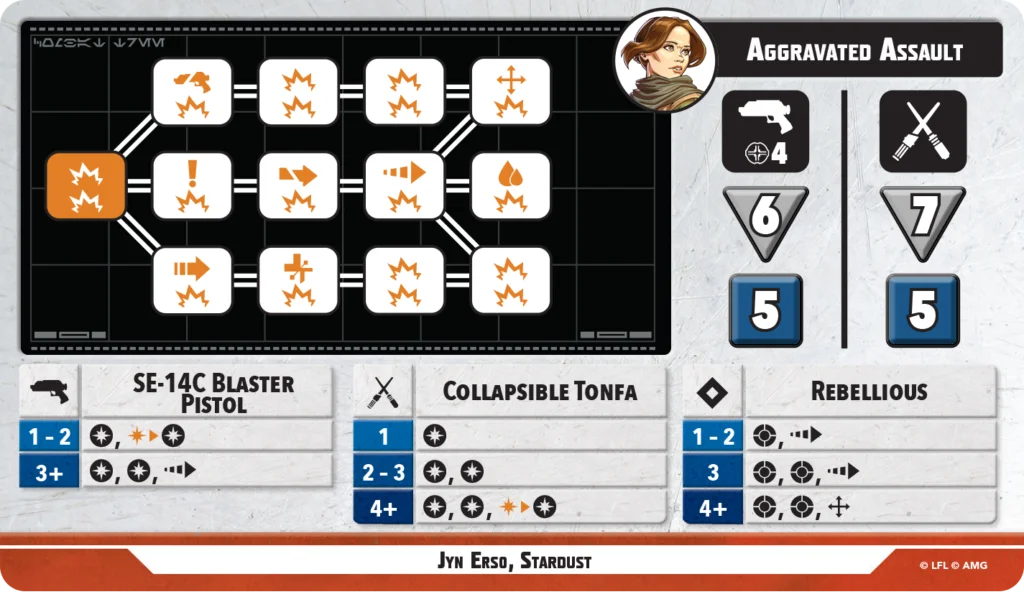 As with all current primaries, Jyn has 2 stance cards. One side is slightly better at melee attacks and the other is slightly better at range, however they are both good at both. In fact when making a reduced dice attack such as her tactical five die attack, her ranged side becomes better and melee and vice versa. The biggest “weakness” of her stance cards is that on both sides her pistol is only range 4. They also share the same defensive dice and expertise. She has no crit mitigation but five defense dice in both melee and ranged combined with an expertise chart that has a dash on one makes Jyn risky to attack. Unless you are expecting to kill her immediately this can make Jyn risky to attack.