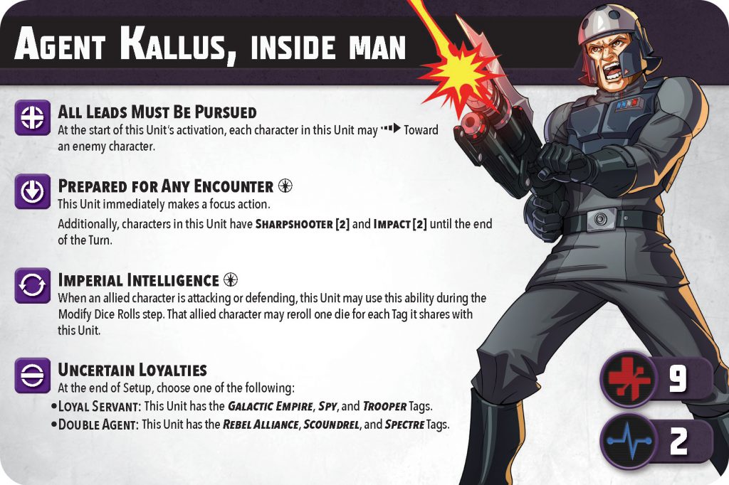 Kanan made a name for himself in Spectre lists mostly for his revenge attack but he was also one the rebel alliance’s best damage dealers and has a Force push if he had force to use it. When paired with Jyn you are not going to have as many Spectre units as you expect, so his revenge attack is not as common but his ability to heal and jump in response to a wound is still very good. Force pushing for one momentum can easily swing an extra objective and struggle. Finally, Kanan is probably the best home for the secondary unit that Jyn buffs the most, Agent Kallus.