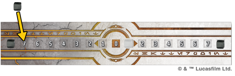 Conflict is a bit of a tug-of-war and represented by a tug-of-war style track. At the end of your turn you'll pull the struggle marker towards your side of the track based on your objective control. On your opponent's turn it will move back. The goal is to pull that marker far enough along the track that it reaches your Momentum marker.