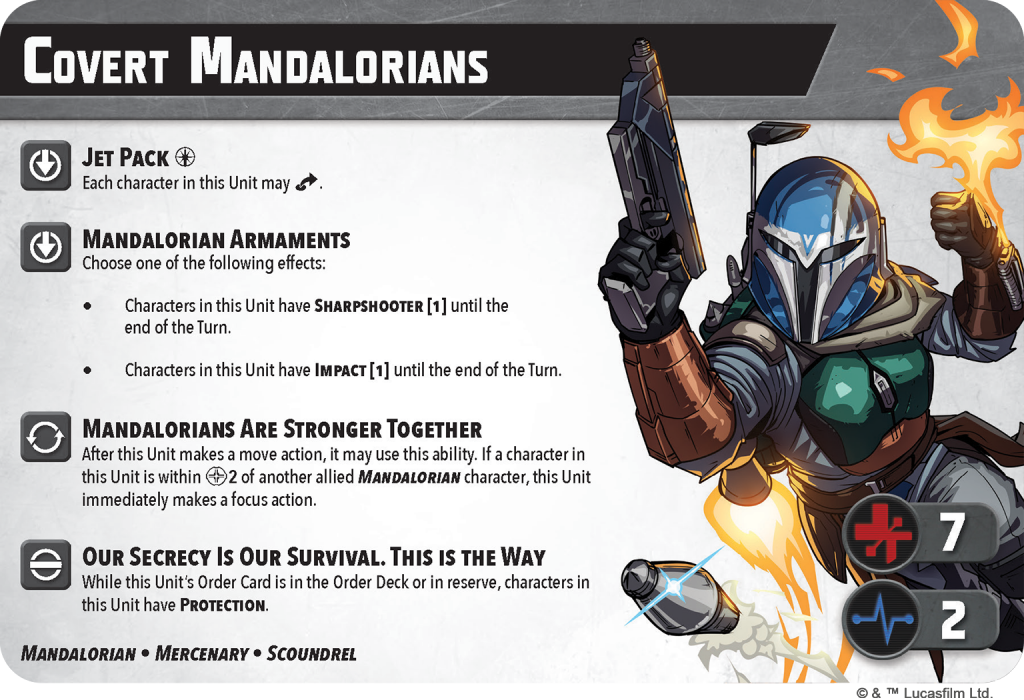 Finally, we have the Support Unit of this box with the Covert Mandalorians. To illustrate having the option of either using their rockets or blasters in combat, their ability Mandalorian Armaments allows them to choose between Sharpshooter and Impact for that turn. Additionally, they can use their Jump Packs to reach objectives or enemy characters at a higher elevation. Mandalorians Are Stronger Together allows them to immediately make a focus action if they end a movement within Range 2 of another Mandalorian unit, and Our Secrecy Is Our Survival. This Is The Way grants them Protection if their card is in Reserve or still in the Order Deck. Their only stance, Adherents of the Way, allows you to really customize how you want to impact your opponent’s units. There are two starting points, but then you can go in any direction for the desired effect after that.