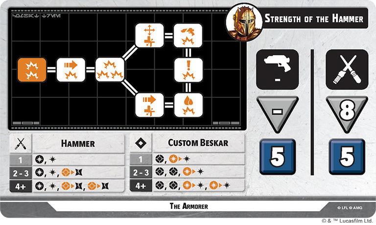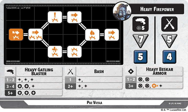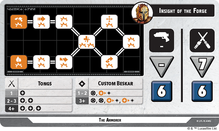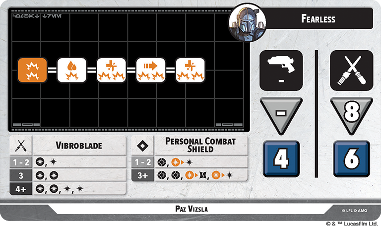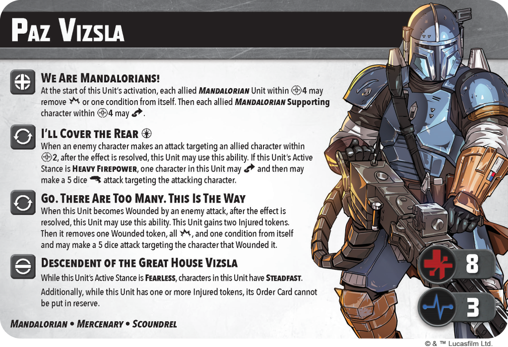 The Secondary Unit in this box comes in at a healthy cost of 5 PC, which partially explains why The Armorer has 9 SP, and also severely limits who he can pair with just from a cost perspective. We Are Mandalorians! is a great Tactics Ability as it allows everyMandalorian unit within Range 4 to remove one damage or condition from itself. If they are a Supporting Unit, they can also jump. His Identity grants him Steadfast if his active stance is Fearless and he can’t go into Reserves if he is Injured. He has two reactive abilities in I’ll Cover The Rear and Go. There Are Too Many. This is the Way. They both allow Paz to attack an enemy unit out of activation, which is always great, especially since the force cost doesn’t increase if he is Wounded or Injured. Go allows him to shake off damage and and a Wounded token in exchange for two injured tokens before making a 5 dice ranged attack. Cover allows him to roll a 5 dice ranged attack after an ally within Range 2 is attacked if Paz’s active stance is Heavy Firepower. His Heavy Firepower stance is more ranged-focused, and Fearless is more geared toward melee. Heavy allows Paz to hand out 7/8 damage depending on the path you choose, as well as Pin, Shoves, Strains, and Recover. Fearless only has one path, and is melee-only. Paz can use his Vibroblade to deal 9 damage as well as Strain, Shove, and two Recovers if he works through all 5 points of his tree.