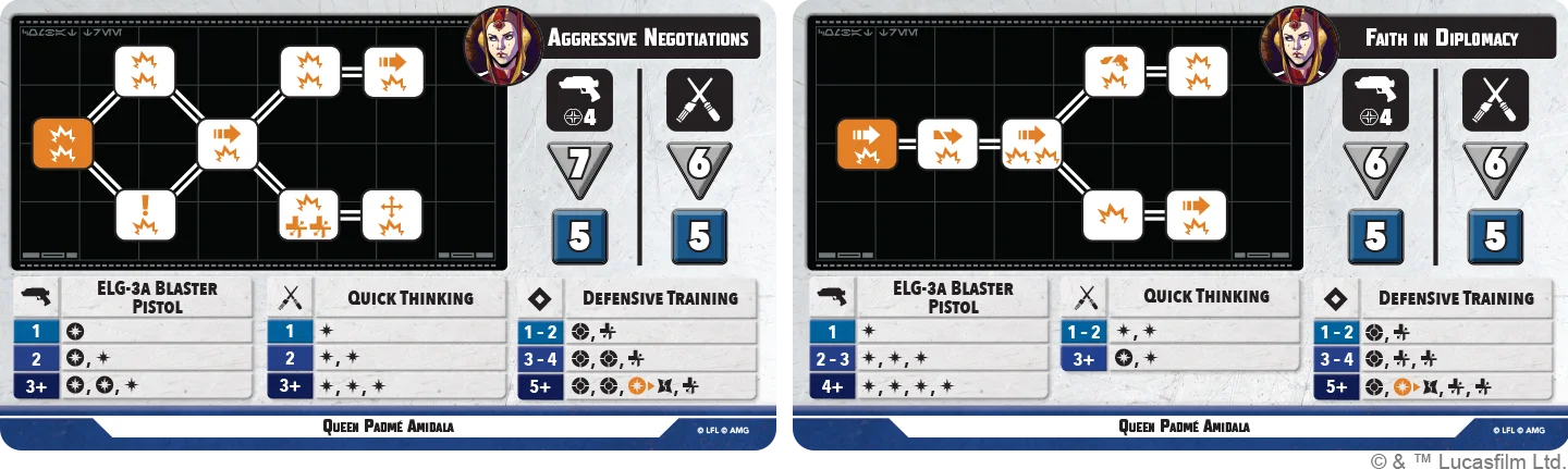This stance is primarily damage-oriented, with utility such as shoves and a reposition coming later on her tree. If Padmé is getting to focus and fire at range, then between the 10 dice she rolls and good access to crits on her offensive expertise, she can reasonably expect to get three to four successes which will tee up a lot of non-primary units. She’s also slightly more defensive trading a recover for a 2nd block at three defensive expertise.