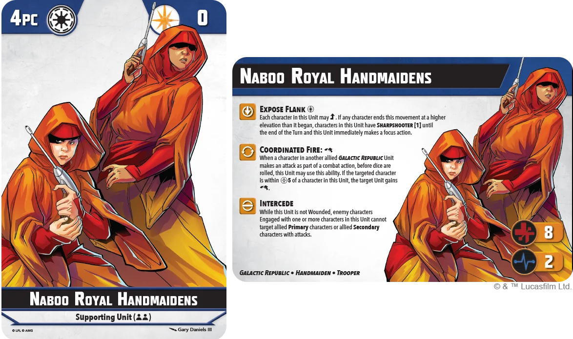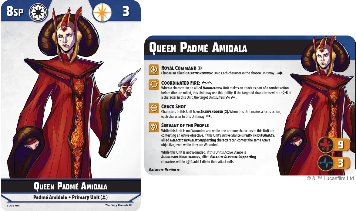 Standard stuff here with a point cost of 4, but they do benefit from that all-important 8th point of health compared to a number of the Republic's Clone Trooper supporting units. Padmé’s ability to allow wounded Supports to contest can ease the pain of them getting easily wounded.