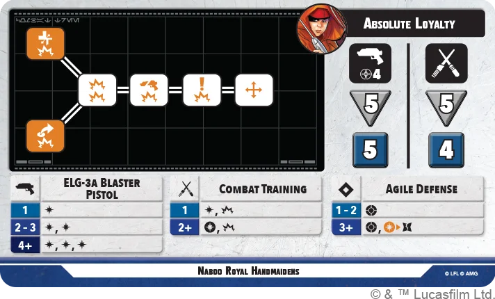 No shoves at all is a tough pill to swallow and five base attack dice means they will be relying on an Expose Flank to reach any reliable kind of output. The most notable element here is access to a jump on one, which can allow them to access some unexpected locations on their activation. Their defensive profile is similarly unexciting, but there is a chance for them to negate a crit if they’re lucky which is not something a lot of supports have access to. The biggest positive thing here is simply having the Handmaiden tag, which means that provided Padmé is close by you can add two free damage to their output with no roll required.