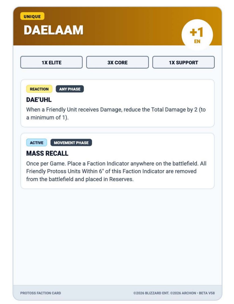 Lastly we have Faction Cards - you will have exactly one of these in your army and it will define what your army’s Faction Tag is as well as your Starting Army Slots. Similar to Tactical Cards, Faction Cards will also have abilities and faction resource values and can be Exhausted in the same way.