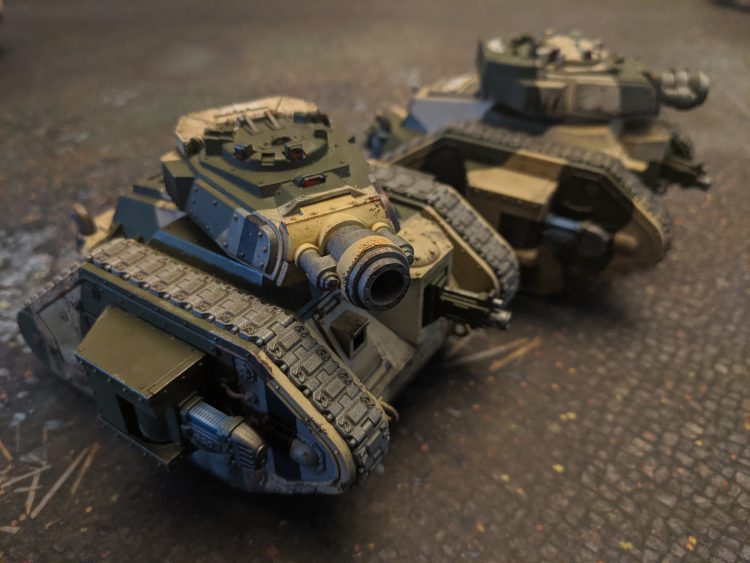 - Grinding Advance: Allows Leman Russ Battle Tanks to fire their turret weapon twice if they've remained stationary or moved under half their movement speed.