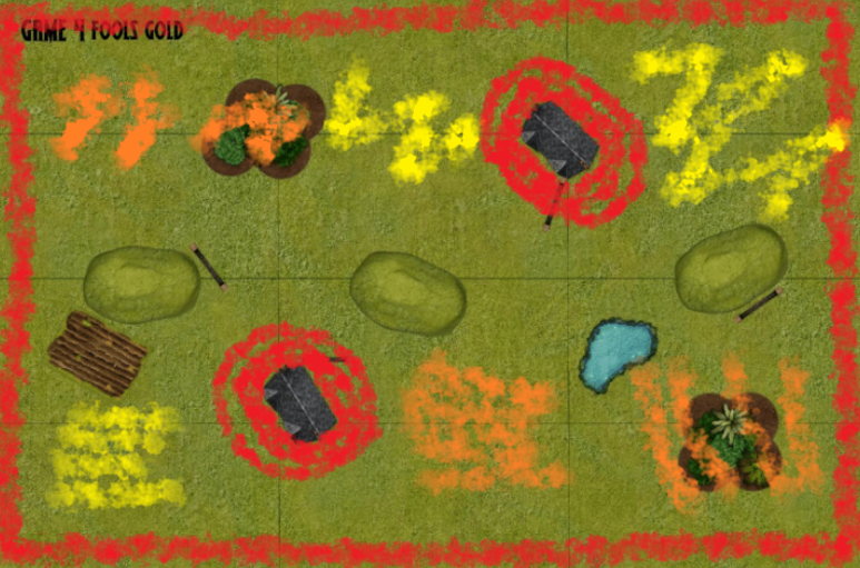 Applying that to this map, we know the objectives can be placed in the non-red areas. The yellow areas are where we likely want to place stuff, and the orange areas are where we don’t want to. As a reminder, Simon wants to put his stuff where he can either get cavalry matched up against an isolated defensive force, or march big blocks of guys across the board at me without getting Hindered. Those are the yellow areas on the top side. The orange area would be nice for me to defend, because it’s close to where my archers want to be, but not where he can march blocks through easily. Meanwhile, I don’t want to give Simon the option to easily do those things, and I want to make sure the fight is where my stuff can shine - though I’m likely going to have to accept my stuff being Hindered in turn, I can handle that a lot better with my stuff. So, no easy holds for him on the bottom right and middle, but the bottom left is looking tasty.