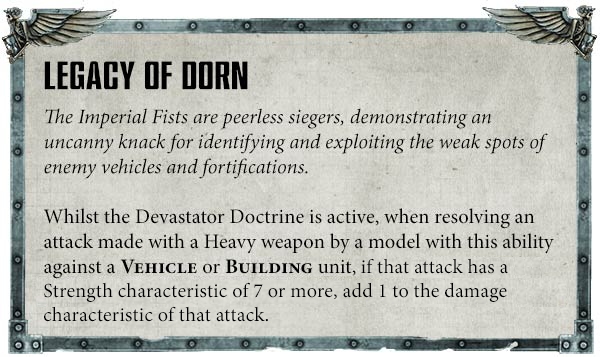 Ultimately though the big downside is that if your opponent doesn't have any, or many, vehicle units, this isn't going to matter much. It's also got no synergy with the Chapter Tactic, which encourages the use of bolters en masse, and as Crimson Fists are limited in their ability to roll back doctrines and re-activate Legacy of Dorn that makes it something that's nice to have but not really something you can build around. You'll likely see more success building around high amounts of bolter fire and taking a small number of things that can benefit from Legacy of Dorn.